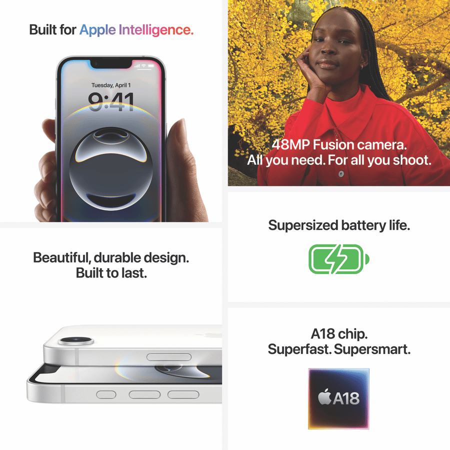 The Latest iPhone at the greatest price with the Apple iPhone 16e 256GB White MD1W4X/A. The iPhone 16e is built for Apple Intelligence(1) to get more done effortlessly, powered by the A18 chip for productivity and gaming prowess alike including regular iOS updates for years to come. Supersized battery life gives up to 26 hours of video playback(2) on the stunning 6.1 inch OLED display with a Ceramic Shield front to protect it long term. Take great shots with the 2-in-1 rear camera system boasting a 48MP Fusion camer for super high res photos and an optical quality 2x Telephoto, also including a quality 12MP front camera for epic selfies. Customise the iPhone 16e with iOS 18 offering home and lock screen options, messages with text effects, Tapback with emoji and the Action Button for quick access to favourite apps among much more. Keep safe and private with Emergency SOS via satellite that works even without WiFi or mobile service(3), Crash Detection(4), Face ID and Apple Intelligence keeping your use and information on device where no-one including Apple can access your data. Disclaimers: (1) Apple Intelligence is available in beta on all iPhone 16 models, iPhone 15 Pro and iPhone 15 Pro Max, with Siri and device language set to English (Australia, Canada, Ireland, New Zealand, South Africa, UK or US), as an iOS 18 update. Additional features and languages will be available in April, with more languages coming over the course of the year. Languages supported in 2025 include Chinese, English (India, Singapore), French, German, Italian, Japanese, Korean, Portuguese, Spanish and Vietnamese.