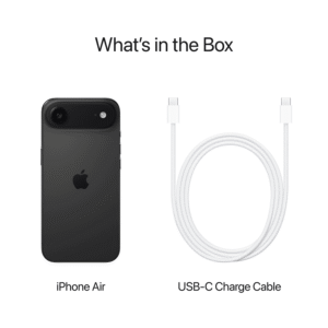 Introducing the Apple iPhone Air 512GB Space Black MG2Q4X/A. The thinnest iPhone ever. 6.5-inch display(1), durable Ceramic Shield front and back, A19 Pro chip, 48MP Fusion camera system and Center Stage front camera. The thinnest iPhone ever, with the power of a pro chip inside. At 5.6 millimetres, iPhone Air is so impossibly thin and light that it nearly disappears in your hand. Ultralight titanium frame. Ceramic Shield protects the back of iPhone Air, making it 4x more resistant to cracks(2). And the new Ceramic Shield 2 on the front has 3x better scratch resistance(3). 48MP Fusion camera system with 2x optical-quality zoom. Effortlessly frame the perfect shot from where you are. Flexible ways to frame your shot. Smarter group selfies, Dual Capture video for simultaneous front and rear recording, and more. A19 Pro is the most efficient iPhone chip yet. Gives you pro performance in a breakthrough thin and light design. All-day battery life with up to 27 hours of video playback(4). A fresh design with Liquid Glass. Beautiful, delightful and instantly familiar. With a more vibrant Lock Screen, customisable backgrounds and polls in Messages, Call Screening and more(5). Personal, private, powerful. Write, express yourself and get things done effortlessly(6). If you don’t have mobile reception or Wi-Fi, iPhone can connect to a satellite so you can contact emergency services(7). And in a severe car crash, iPhone can call for help when you can’t(8). Stay connected at faster speeds with secure connections to Wi-Fi 7(9), 5G networks(10) and Bluetooth 6, plus eSIM(11). iPhone Air activates with an eSIM. With eSIM, you enjoy greater flexibility, enhanced convenience, increased security and seamless connectivity, especially when travelling internationally. A whole new level of privacy and security. Built in. Disclaimers: (1)The display has rounded corners that follow a beautiful curved design, and these corners are within a standard rectangle. When measured as a standard rectangular shape, the screen is 6.55 inches (iPhone Air) diagonally. Actual viewable area is less. (2)Compared with the glass back of previous-generation iPhone. (3)Compared with previous-generation iPhone. (4)All battery claims depend on network configuration and many other factors; actual results will vary. Battery has limited recharge cycles and may eventually need to be replaced. Battery life and charge cycles vary by use and settings. (5)Some features may not be available in all countries or all areas. (6)Apple Intelligence is available in beta. Some features may not be available in all regions or languages. (7)Satellite features are included for free for two years with the activation of any iPhone 14 or later model. Connection and response times vary based on location, site conditions and other factors. Some satellite features require a carrier plan. Satellite connectivity is provided by Globalstar and its affiliates. (8)iPhone 17, iPhone 17 Pro and iPhone Air can detect a severe car crash and call for help. Requires a mobile network connection or Wi-Fi calling. (9)Wi-Fi 7 available in countries and regions where supported. (10)Data plan required. 5G is available in selected markets and through selected carriers. (11)iPhone Air models are activated with an eSIM. eSIM requires a carrier that supports eSIM and a carrier plan. See your carrier for details.