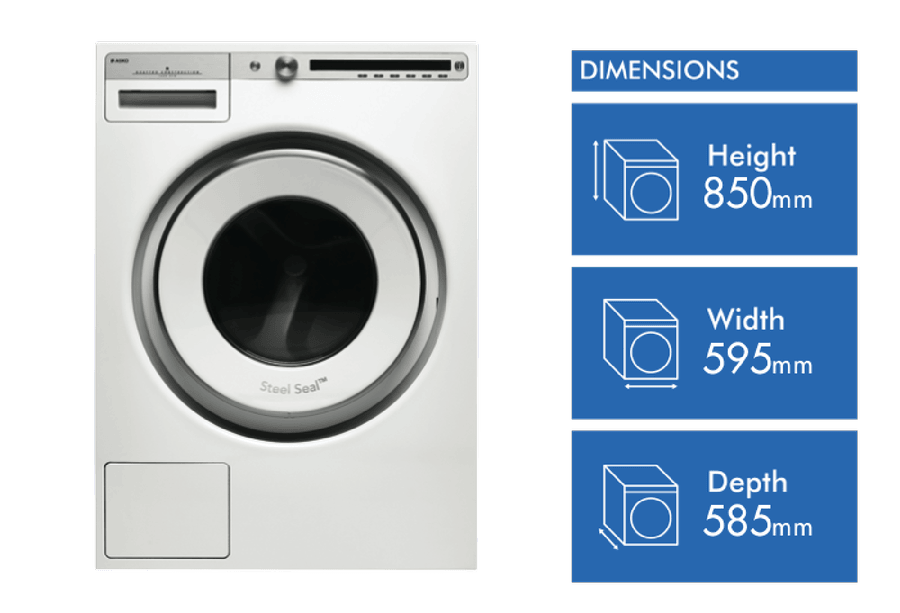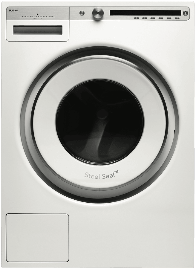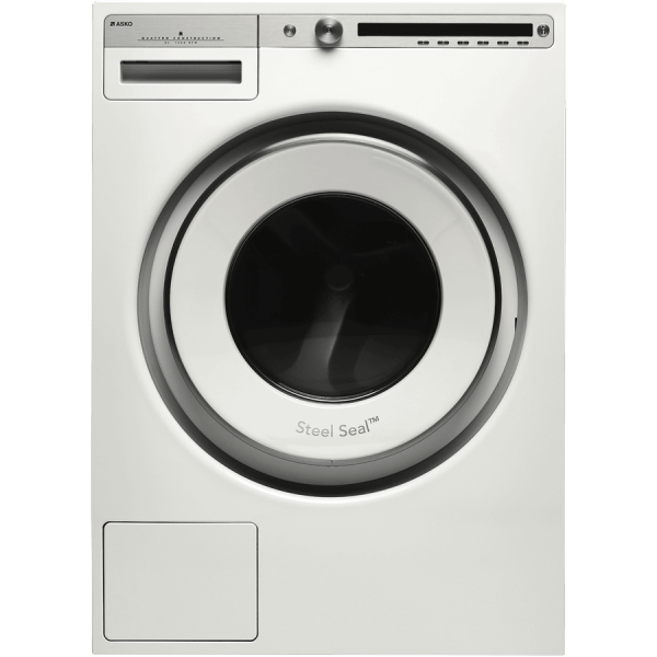 This white Asko front-loading washer has a high 5 star WELS water rating and a 5 star energy for bill savings, and the capacity to wash 8kg of dry laundry per load so you can save money by running fewer loads of laundry for your 3-4 person household. It features 21 types of programs, including Hygiene and Allergy care cycles for specialised garment treatment. Also, the white Asko W4086PW’s high 1600rpm maximum spin speed helps you reduce your drying time. Sensitive Choice endorsed by the Asthma Council, this ASKO washing machine offers a more hygienic wash by eliminating the rubber door below and instead utilising a SteelSeal door so there’s no build up of dirt, grime and mould over time. Instead of just relying on the water at the bottom of the drum, the ASKO Pro Wash system actively circulates the water and detergent from the bottom of the drum to the top where two nozzles spray the mix over the inner drum which is then guided by the lifters and eventually sprayed onto the load. This means the load is soaked faster, which enables superb washing and rinsing performance even with very short washing cycles. This white front-loading washer is 850mm high, 595mm wide, and 585mm deep, so measure your laundry carefully to ensure it will fit, remembering to leave at least 2.5 cm between the washer and the wall, and enough space above for a dryer if you want to wall mount it above the washer.