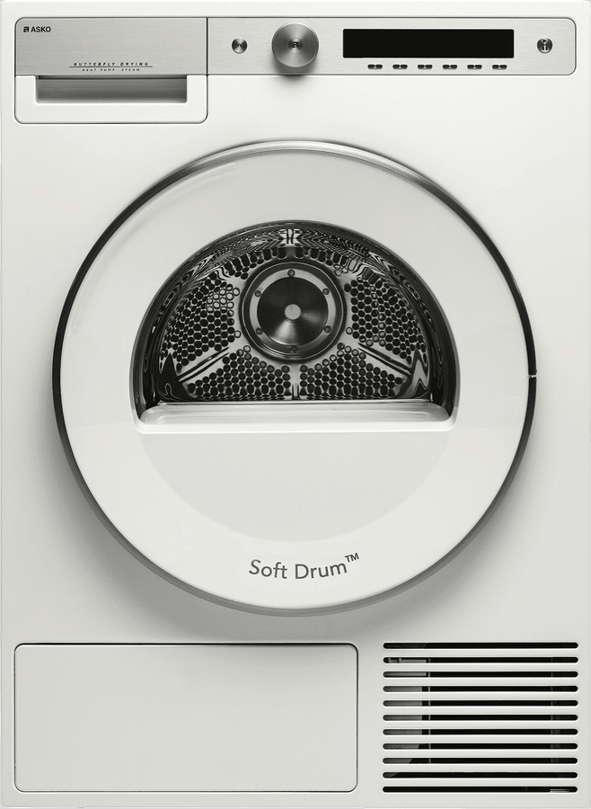 Say goodbye to damp, creased laundry with the ASKO 8kg Style Heat Pump Dryer. This innovative clothes dryer boasts an impressive 8 star energy rating for low running costs and an 18 program AutoLogic system to expertly dry everything from jeans to woollens. With its large 8kg drying capacity, anti-crease function and special steam cycles, this dryer makes easy work of even the biggest loads. The ASKO dries clothes gently thanks to its Self Cleaning Condenser and heat pump technology. Options like the low temperature setting and customisable dryness levels ensure your garments are dried just right. While the delayed start function lets you schedule drying when it suits. This dryer can even refresh tired clothes with steam and reduce creases with the handy Airing setting. With a stylish smooth white finish, this dryer will complement your laundry while taking up minimal space at 595mm wide. It can be wall mounted for a streamlined look. ASKO have designed this dryer to be simple and efficient. The intuitive controls and self cleaning condenser reduce maintenance. So you can enjoy fresh dry laundry for years to come. The manufacturer’s part number for this product is T608HX.W.AU. Bring the very best in laundry technology into your home with the ASKO 8kg Heat Pump Dryer today.