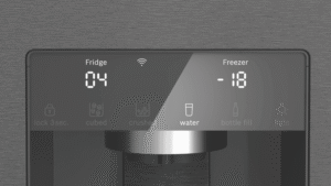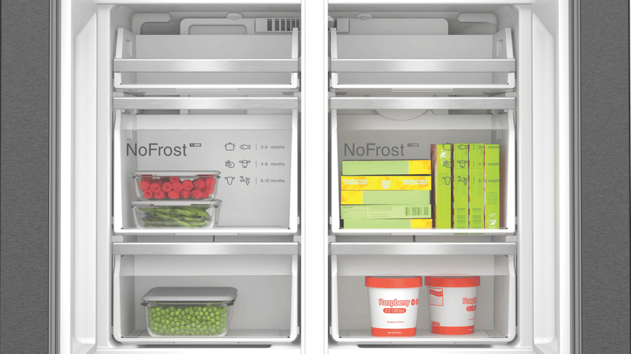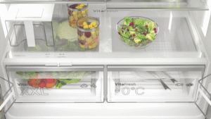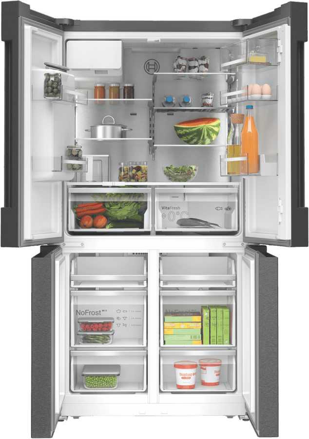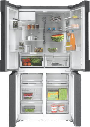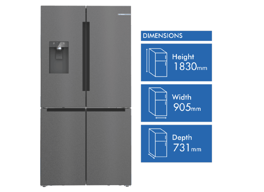 Looking for a fridge that’s big on space and style? This Bosch 574L Quad Door Refrigerator keeps your food fresh and your kitchen looking sleek. With its spacious 375L fridge and 200L freezer, you’ll have plenty of room for all your groceries. The VitaFresh XXL system helps keep your fruits and veggies crisp, while the Metal Backwall with Multi Airflow ensures even cooling throughout. Need ice or water? No plumbing required – just fill up the built-in dispenser. You can control fridge and freezer temps separately, and the LED lighting makes it easy to find what you need. The Big Box drawer is perfect for bulky frozen items. At 905mm wide, 1830mm tall, and 731mm deep, this black beauty fits right into your kitchen. Plus, it comes with a 2-year warranty for peace of mind. The model number is KFI96AXEAA.