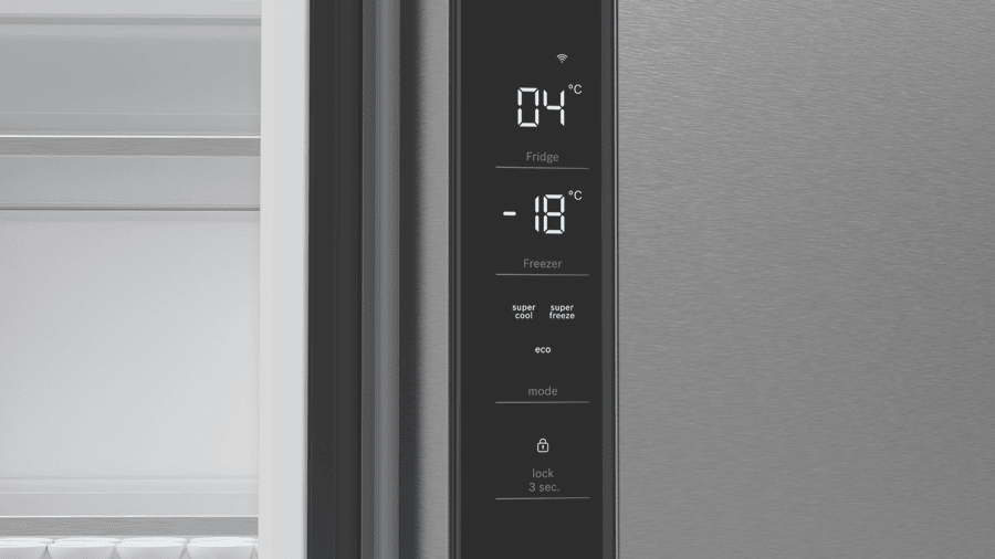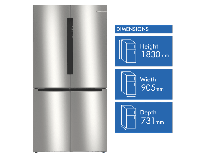 This Bosch 605L Quad Door Refrigerator gives you plenty of space for all your fresh and frozen foods, with a generous 405L fridge capacity and 200L freezer space. The brushed steel finish adds a touch of style to your kitchen while the VitaFresh Plus system helps keep your produce fresher for longer. With Total No Frost technology, you’ll never have to defrost again, and the metal backwall with Multi Airflow ensures even cooling throughout. Control everything through the Home Connect app, while features like LED lighting, child lock and SuperCooling function make this fridge both practical and convenient. This energy efficient 4.5 star rated refrigerator comes with a 2 year warranty. Model number: KFN96APEAA.