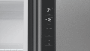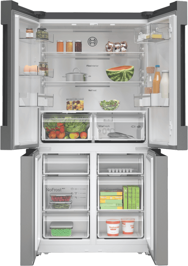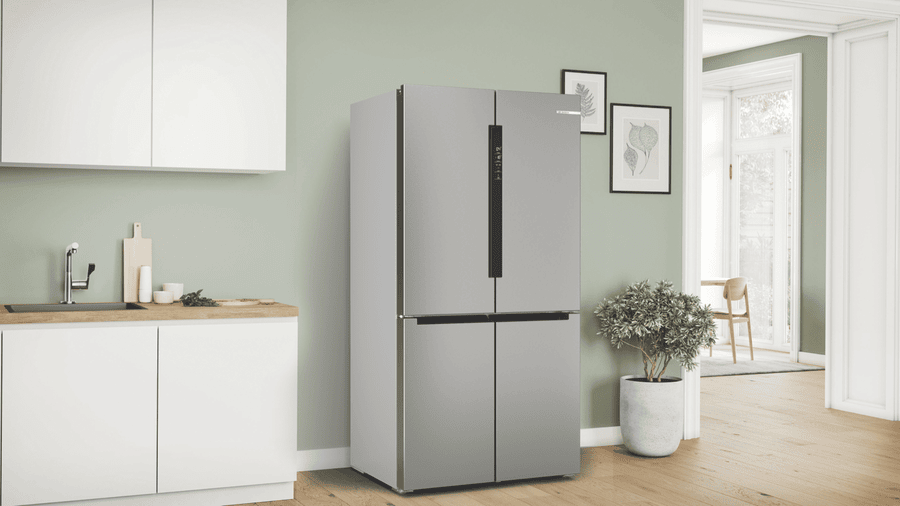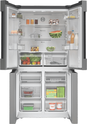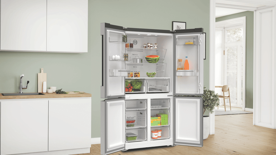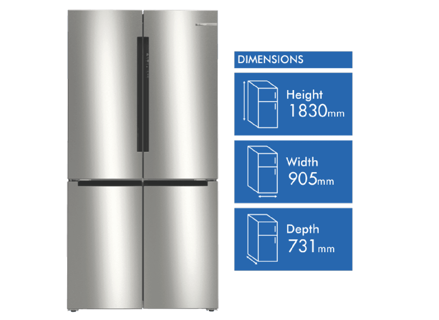 This Bosch Series 4 Quad Door Fridge keeps your food fresher for longer with its VitaFresh XXL system. You’ll love the spacious 605L capacity, with 405L for fresh food and 200L for frozen items. The glossy backwall and multi-airflow system help maintain consistent temperatures, while LED lighting makes it easy to find what you need. There’s even a big box drawer for bulky frozen foods. With a 4.5 star energy rating, it’s efficient too. The stainless steel finish looks great in any kitchen, and features like child lock and super cooling add convenience. It’s frost-free, so no more manual defrosting. Measuring 905mm wide, 1830mm tall, and 731mm deep, this fridge fits well in most kitchens. The model number is KFN96VPEAA and it comes with a 2-year warranty.