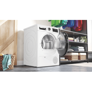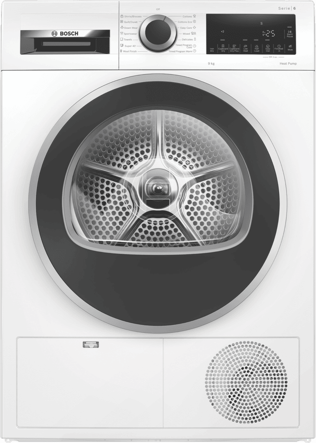 Step into the future of laundry with the Bosch 9kg Heat Pump Dryer. This innovative clothes dryer combines superior drying performance with energy efficiency, drying up to 9kg of laundry while achieving an impressive 7 star energy rating. The advanced heat pump technology gently dries clothes at lower temperatures, protecting fabrics while reducing energy consumption. 14 specialized drying programs cater to everything from cottons and shirts to sportswear and delicates, while options like the super 40 minute mixed load program provide extra convenience. With a sleek white finish, anti-vibration design for quiet operation, and a large internal drum, this dryer makes doing laundry simple. The intuitive control panel allows you to select timed drying, auto dry or choose from various dryness levels. Drying sensor technology prevents over-drying to care for your clothes.Backed by Bosch’s reputation for quality and a 2 year warranty, this dryer provides the ultimate laundry solution. The manufacturer’s part number for this product is WQG24200AU. Check out this innovative Bosch dryer today to discover the possibilities.