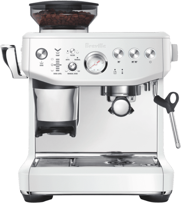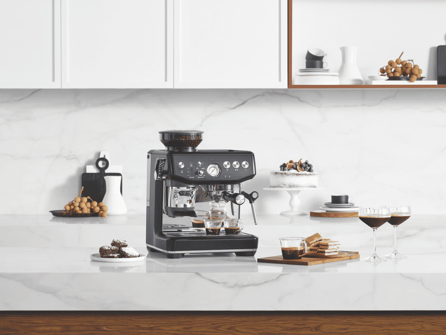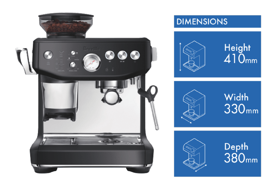 Breville’s the Barista Express Impress Black Truffle BES876BTR4IAN1 does just as its name says. Create third wave specialty coffee at home from bean to espresso in less than a minute once heated up, thanks the best of the Barista Express with the Impress Puck System allowing mess free, evenly packed doses measured and tamped to perfection. Achieve the perfect dose and a precise tamp while reducing the grinds on bench tops, ensuring a perfect espresso, latte or flat white with nine bars of pressure and 130 degrees of steam in the milk wand creating silky micro foam on top.