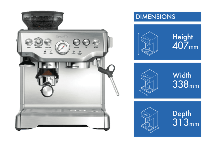 Kick start your day with cafe-quality coffee from the comfort of home with this stainless steel Breville the Barista Express BES870BSS – the perfect coffee machine for both beginner baristas and more experienced coffee makers. Simply add your favourite roasted beans to the bean hopper, then press a button to let the machine grind and dose your portafilter with the right amount of freshly grounded coffee for a delicious tasting brew. Select your preferred cup volume and the machine’s automatic dosing will dispense the required amount of coffee. It has an adjustable grind size dial for coffee your way. To create cappuccino, flat white or latte, use the steam wand to texture and heat the milk to a silky-smooth consistency. This Breville espresso machine uses preinfusion to gradually increase water pressure to gently expand grinds for even extraction. Plus, it automatically adjusts the water temperature after steam for optimal espresso temperature. You can experience an authentic tasting espresso or milky coffee favourite with this Breville the Barista Express coffee machine.