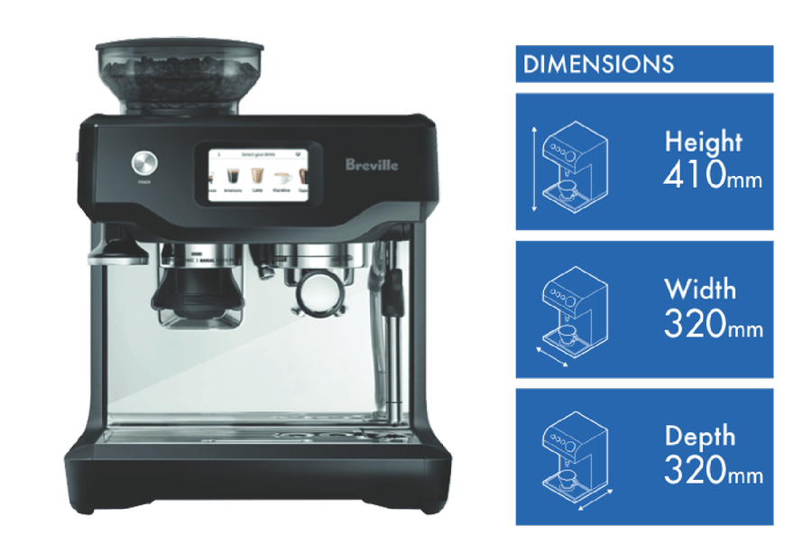 Take your home barista skills to new levels with the Breville The Barista Touch. This sleek manual espresso machine delivers café-quality coffee drinks with ease thanks to its intuitive touchscreen and precise extraction. With a powerful 1680W ThermoJet heating system, you’ll go from bean to cup in no time. Simply select your drink of choice from the menu and let The Barista Touch do the work. Its 15 bar Italian pump ensures optimal flavor extraction and microfoam milk texturing for velvety lattes and cappuccinos. Adjust grind size, shot temperature and volume to customize each beverage to your taste. The built-in conical burr grinder with dose control grinds beans right before extraction for incredibly fresh, full-bodied espresso. With a 2L removable water tank, 250g sealed bean hopper, precise PID temperature control and hands-free auto steam wand, this machine takes the guesswork out of making café favorites at home. Cleaning and maintenance are straightforward with included accessories like a stainless steel jug, cleaning disc and tablets. Bring the café home with The Barista Touch. Its sleek black truffle color and compact size fit perfectly on your kitchen counter without taking up too much space. The manufacturer’s part number for this product is BES880BTR. Discover barista-quality coffee drinks with The Barista Touch.