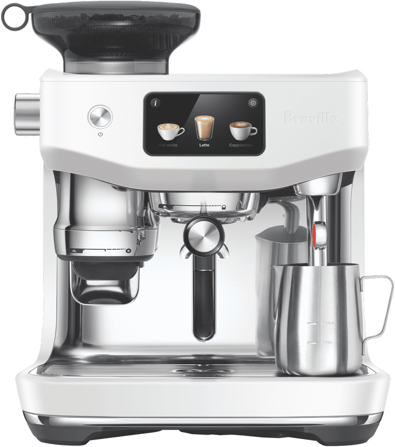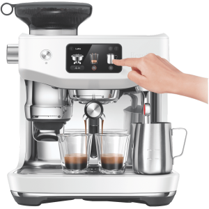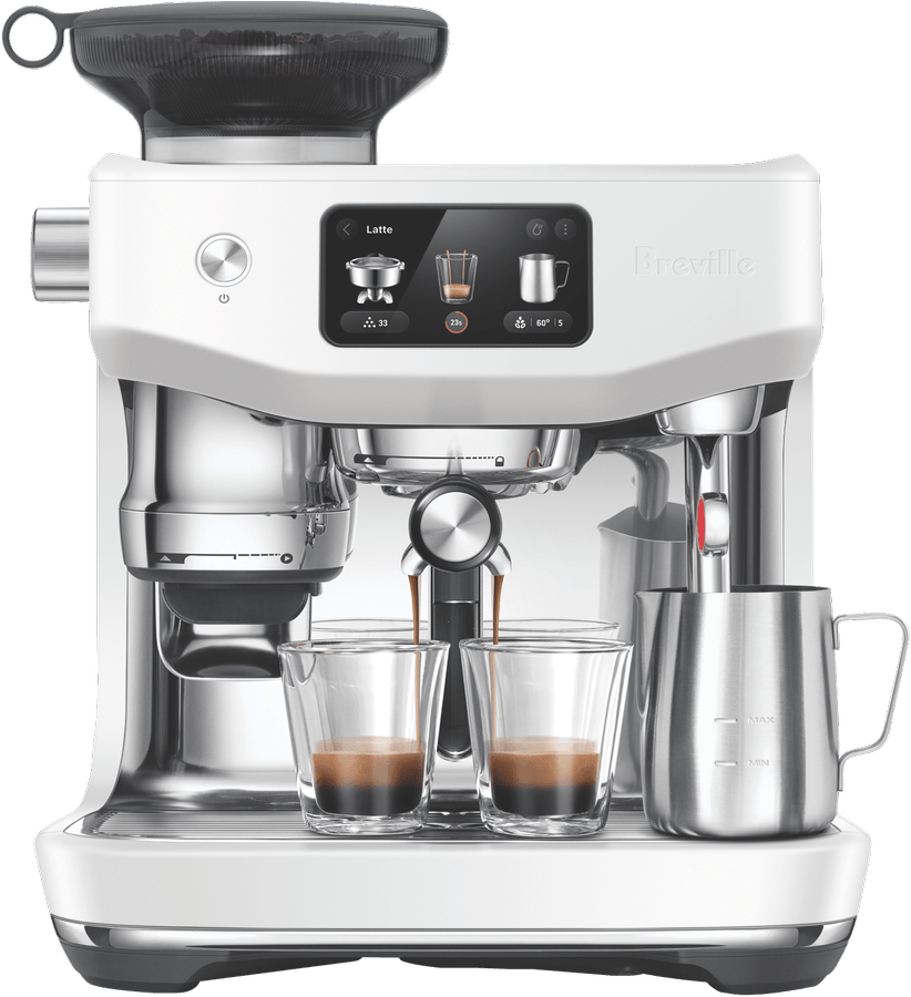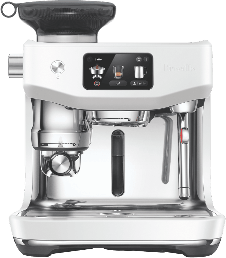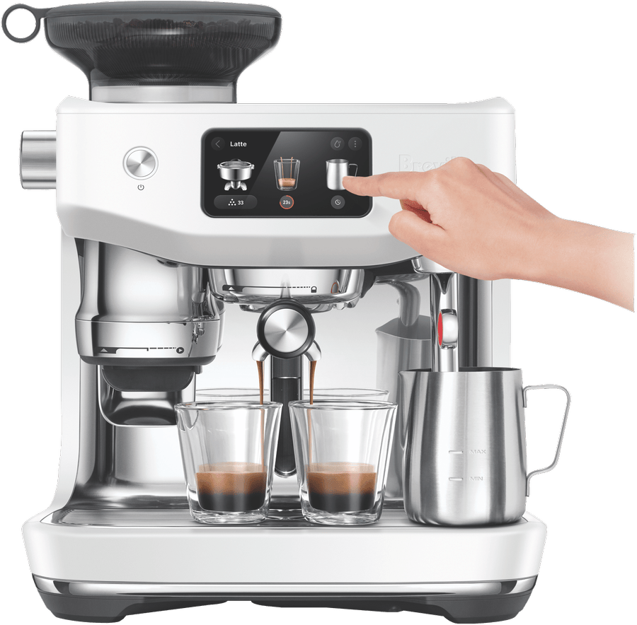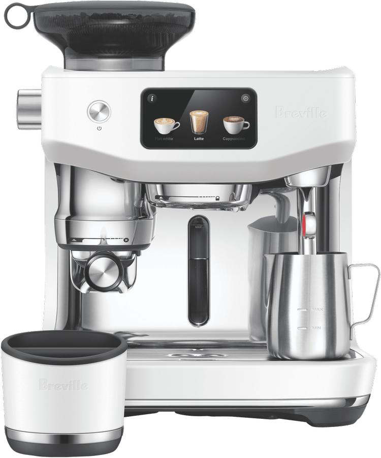 - Integrated grinder auto grinds, doses and tamps 22g coffee
