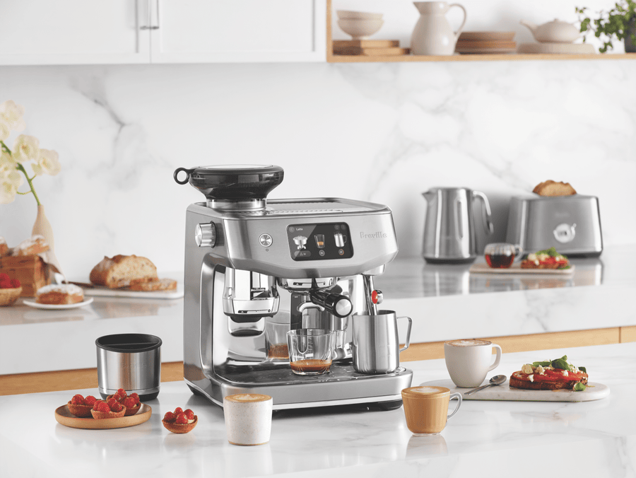 • Integrated grinder auto grinds, doses and tamps 22 grams