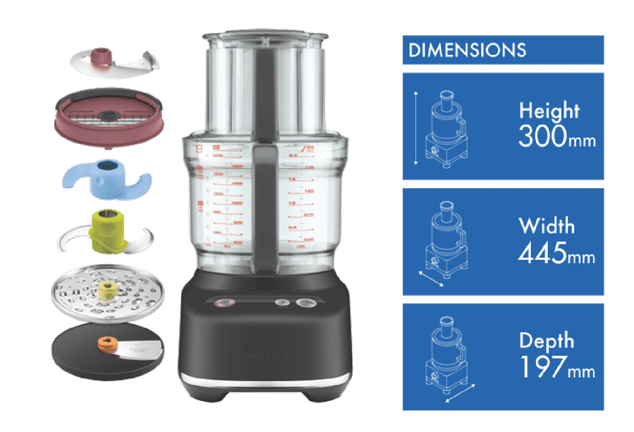 Elevate your culinary creations with the Breville The Paradice 9 Black Truffle Food Processor. This sleek and stylish appliance boasts a BPA-free, impact and shock resistant bowl housed in a durable stainless steel body. With a powerful 605-watt brushless induction motor, tackling even the toughest ingredients is a breeze. The generous 9-cup capacity and wide 120mm feed chute make prepping large batches a snap. Enjoy the convenience of the integrated storage caddy, which neatly houses the dicing kit, S-blade, reversible shredder, adjustable slicer, and dough blade. The included large half grid and blade system allows for precise 12mm dicing. Cleaning up is a cinch with the dishwasher-safe bowl and lid. Measuring 300mm high, 445mm wide, and 197mm deep, this food processor is the perfect addition to your kitchen arsenal. The Breville The Paradice 9 Black Truffle (BFP638BTR2IAN1) comes with all the essential accessories and is backed by a 2-year manufacturer’s warranty. Discover the joy of effortless food preparation and take your culinary skills to new heights with this exceptional appliance.