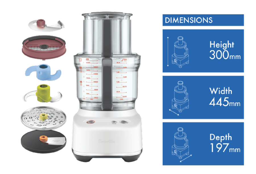 Introducing the Breville The Paradice 9 Food Processor in a stunning Sea Salt finish (BFP638SST2IAN1). With a powerful 605-watt brushless induction motor and a generous 9-cup capacity bowl, this food processor is ready to tackle any kitchen task. The BPA-free, impact and shock resistant bowl ensures durability, while the stainless steel housing adds a touch of elegance to your countertop. Enjoy the convenience of the wide 120mm feed chute and the integrated storage caddy that houses all the accessories, including the dicing kit, S-blade, reversible shredder, adjustable slicer, and dough blade. The colour-coded accessories in the Chef’s Armoury make it easy to find the right tool for the job. With dishwasher-safe parts and a compact design (300mm H x 445mm W x 197mm D), cleanup and storage are a breeze. The Paradice 9 also includes a large half grid and blade system for precise 12mm dicing. Backed by a 2-year manufacturer’s warranty, this versatile food processor is your ultimate kitchen companion. Elevate your culinary creations with the Breville The Paradice 9 Food Processor.