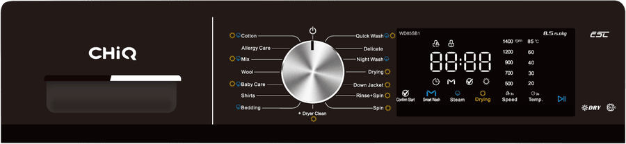 This 8.5kg washing and 5kg drying combo handles all your laundry needs in one space-saving appliance. With a powerful 1400 RPM spin speed, your clothes come out less damp, which means shorter drying times. The 17 washing programs include practical options like quick wash and specialized cycles such as baby care and allergy care, so you can tailor each wash to your specific needs. Plus, the steam wash feature helps remove stubborn stains while the smart wash function automatically selects the optimal cycle. Backed by a 3-year warranty. Model WD85SB1.