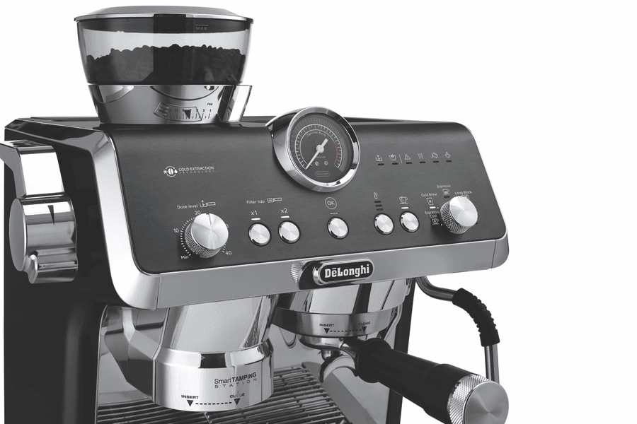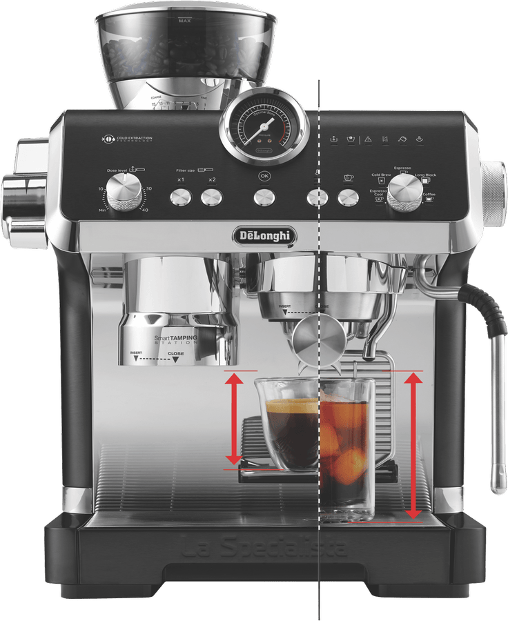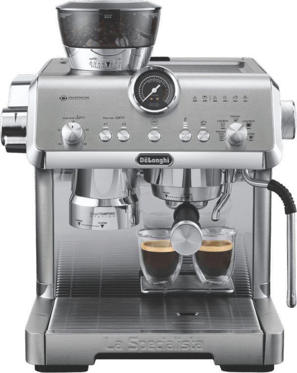 Elevate your coffee experience with the DeLonghi La Specialista Opera Manual Coffee Machine. This premium coffee machine boasts a precious full metal and chromed design, delivering both style and durability to your kitchen. With a powerful 1550 watt motor and 19 bar pump pressure, the La Specialista Opera ensures optimal extraction for rich, aromatic espresso. The advanced Thermoblock heating system and active temperature control with PID maintain consistent water temperature throughout the brewing process. Enjoy the convenience of the removable 2 litre water tank and the integrated 250g beans container with sensor grinding technology and 15 grind settings. The My LatteArt steam wand allows you to create silky smooth milk foam for your favorite cappuccinos and lattes. Explore a range of brewing options, including 3 coffee infusion temperature settings, cold brew, and more. The smart tamping station ensures precise and even tamping for the perfect shot every time. The La Specialista Opera comes with a range of accessories, including a 350ml milk jug, single and double wall filters, and cleaning tools. EC9555BK is the manufacturer’s part number of this product. Experience the artistry of manual espresso making with the DeLonghi La Specialista Opera Manual Coffee Machine and elevate your daily coffee ritual.