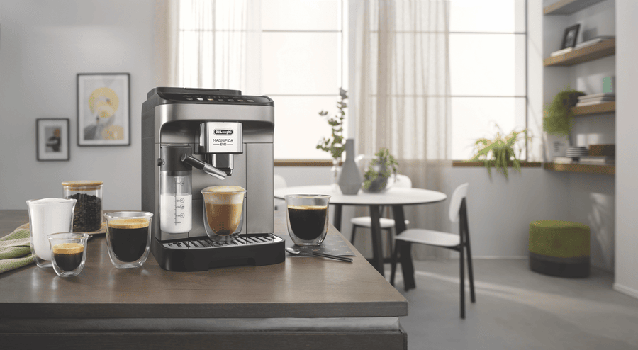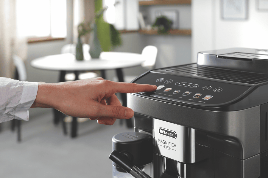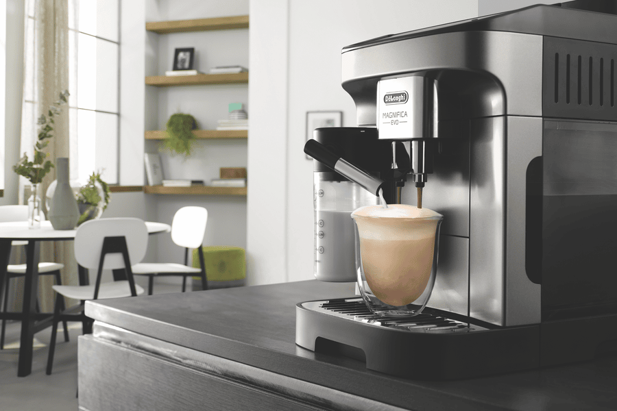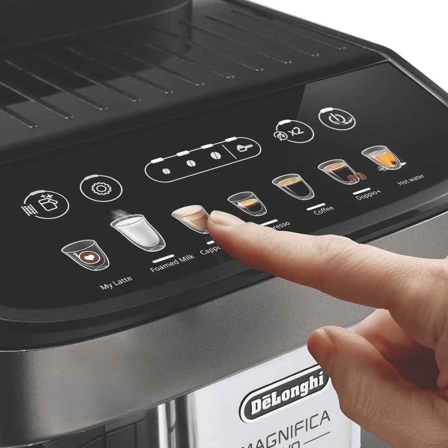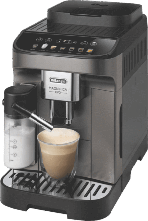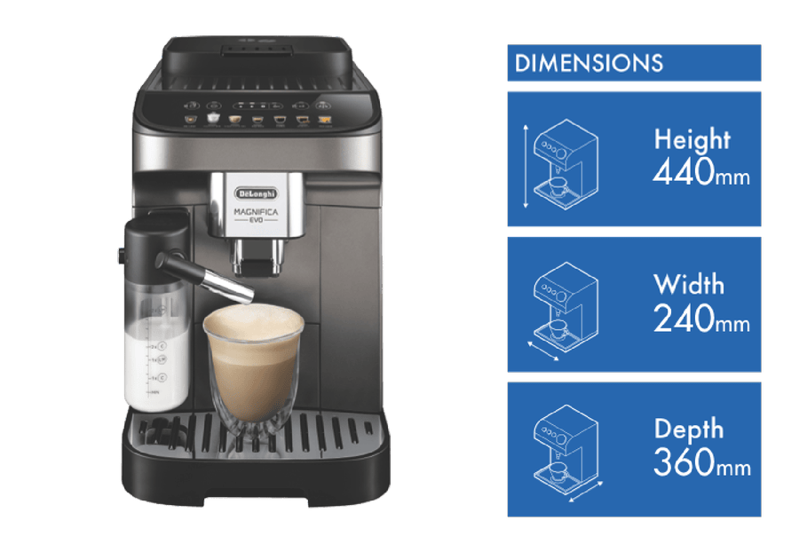 Enjoy your favourite café style coffee without the usual manual handling required for authentic espresso with the DeLonghi Magnifica Evo Fully Automatic Coffee Machine ECAM29031SB – Titan. From beans to coffee perfection; select from one-touch colour recipe icons and Magnifica Evo Titan will only grind the necessary amount of coffee needed for the selected beverage to preserve the coffee bean aroma and reduce any coffee waste for only the freshest brew every time. Plus, the brewing unit doses and tampers the powder just like a professional barista, to guarantee the optimal infusion pressure to extract the perfect creamy, dense, aromatic coffee. Create delicious milk-based recipes with the exclusive LatteCrema System which mixes steam and milk into the ideal textured froth giving more body to your coffee with long-lasting, creamy milk foam with a silky-smooth texture and consistently at the perfect temperature. Customise the right amount with the MyLatte function. Creating the authentic barista coffee experience at home has never been simpler – or more stylish with this intuitive and easy-to-use DeLonghi coffee machine.