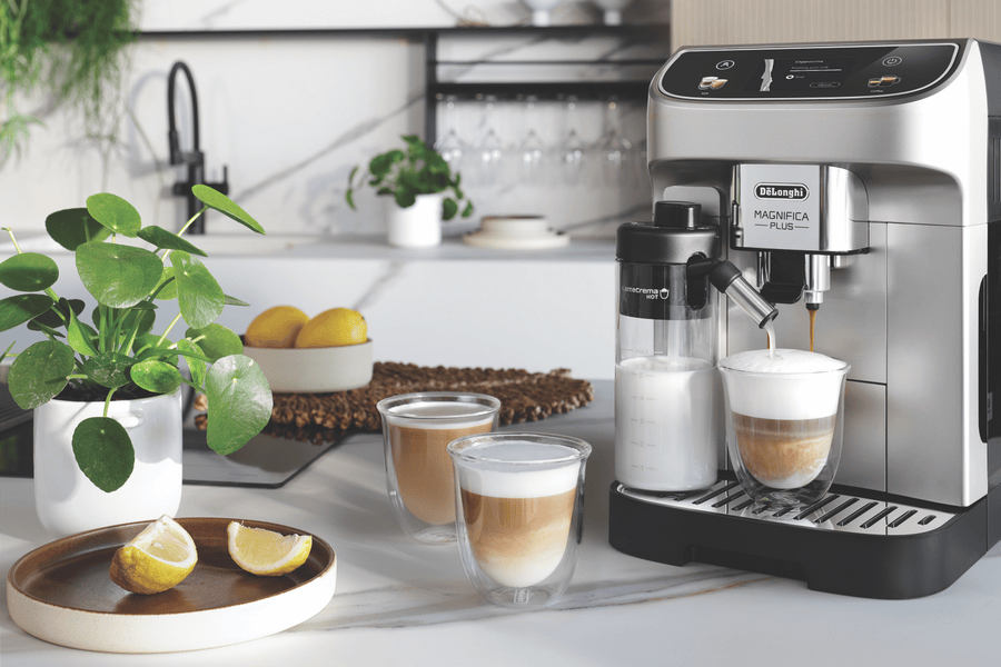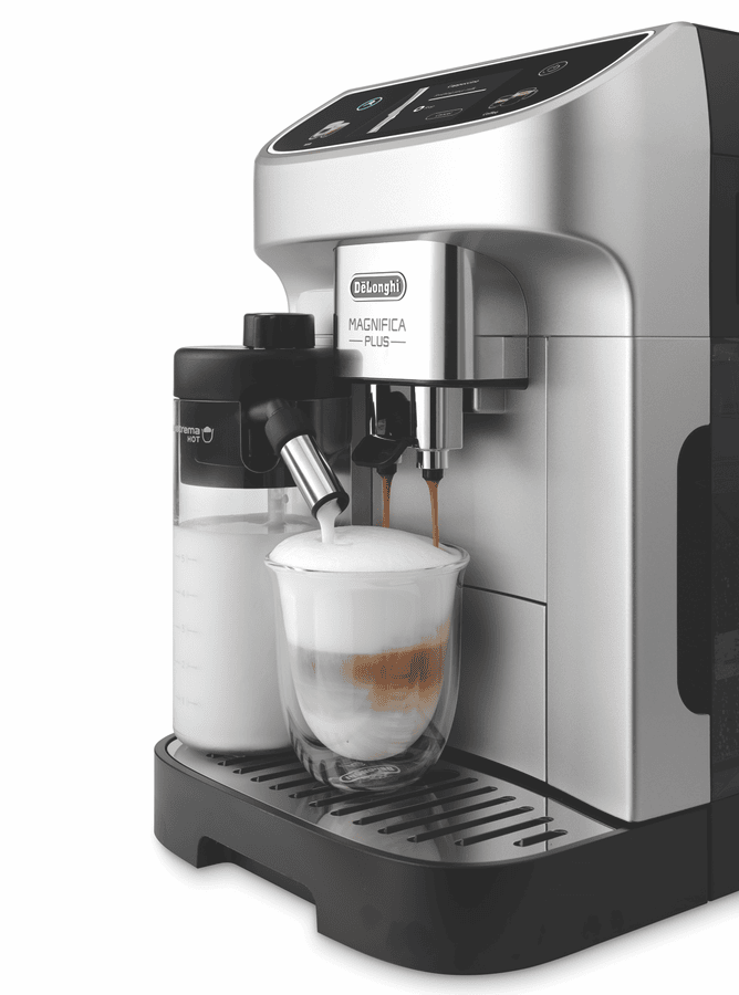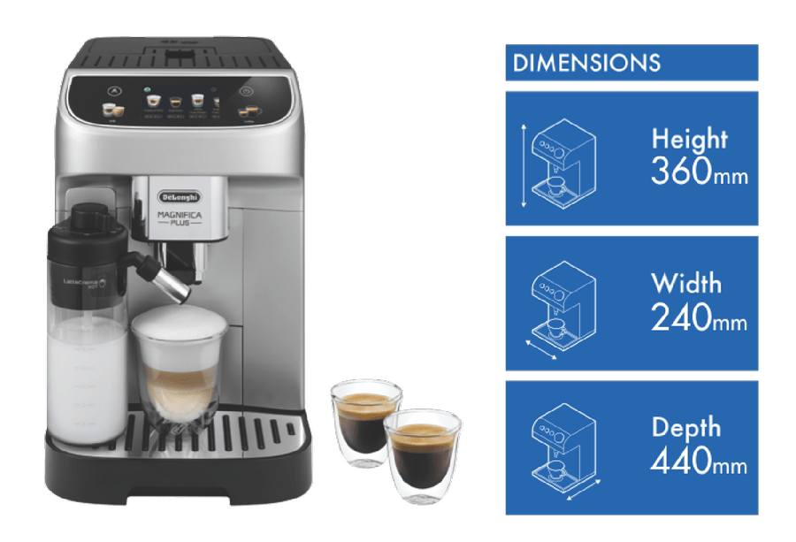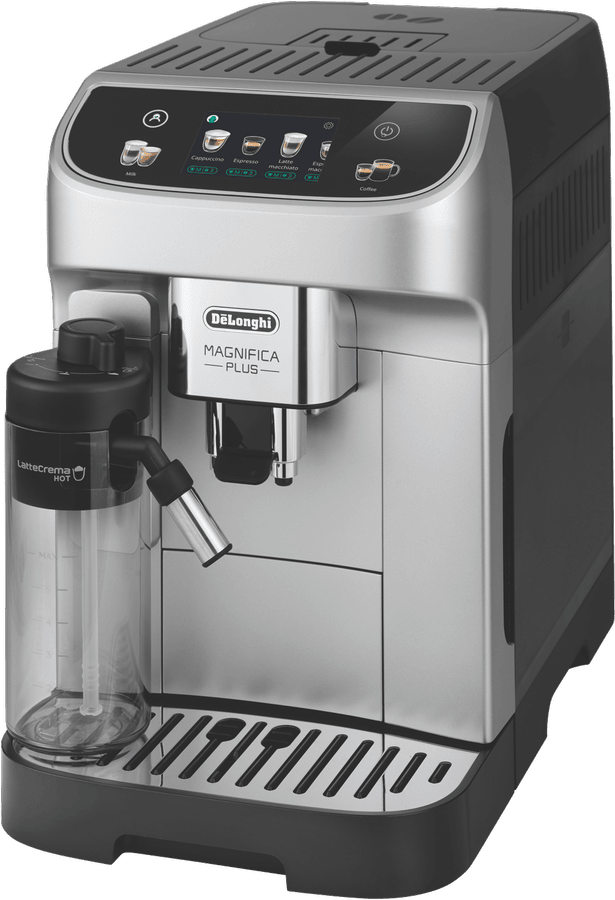 Bring the authentic Italian cafe experience to your kitchen with the DeLonghi Magnifica Plus Fully Automatic Coffee Machine. This sleek silver coffee machine delivers barista-quality espresso, cappuccino and latte with the touch of a button. The integrated conical burr grinder with 13 adjustable settings grinds beans fresh for each cup. Choose from 18 coffee and milk drinks like espresso, cappuccino, latte macchiato and more at the optimal temperature using the dual thermoblock heating system. Froth milk manually with the pannarello wand or automatically with the detachable milk carafe. With a 1.9L removable water tank, 15 bar pressure pump and a maximum cup height of 140mm, this coffee machine brews coffee just the way you like it. The easy to use control panel provides one-touch beverage selection and digital programmability. Keep your Magnifica Plus in top condition with the provided descaling solution and water filter. Bring cafe-style coffee drinks into your home with the DeLonghi Magnifica Plus Fully Automatic Coffee Machine. The manufacturer’s part number for this product is ECAM32070SB.