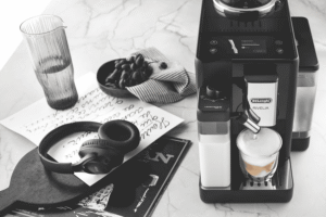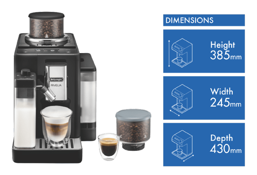 Craving a barista-quality coffee from the comfort of home? The DeLonghi Rivelia Fully Automatic Coffee Machine delivers. With sleek onyx black styling, this all-in-one machine brews authentic espresso, long blacks and 16 coffee and milk varieties at the touch of a button. The 19 bar pump pressure extracts maximum flavor and aroma from beans, while a 1.4L removable water tank keeps you caffeinated all day. Switch between two 250g bean hoppers to enjoy a range of blends, with an integrated conical burr grinder delivering the optimal grind size for each variety. Create creamy cappuccinos, lattes and flat whites with the built-in milk frother, for cafe-worthy drinks in your own kitchen. Measuring 385mm high x 430mm deep x 245mm wide and weighing 9.7kg, the compact Rivelia machine will look stunning on your benchtop. With a 2 year warranty for added peace of mind, this fully automatic espresso machine makes it easy to craft barista-quality coffees at home. EXAM44055B is the manufacturer’s part number for this product. Bring the cafe experience home with the DeLonghi Rivelia.