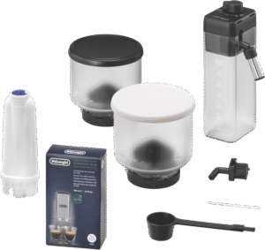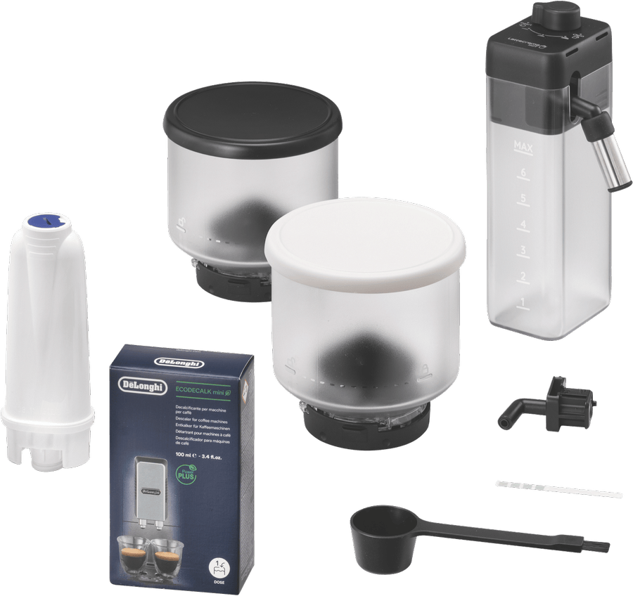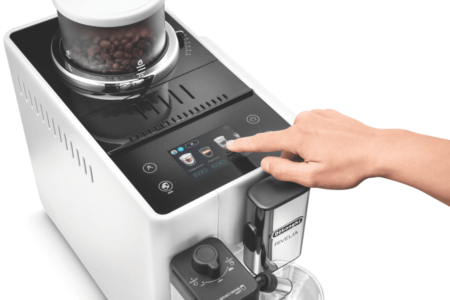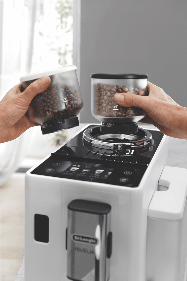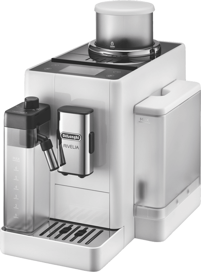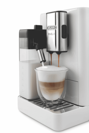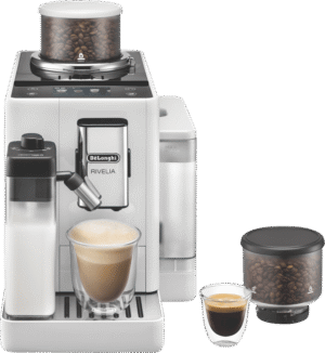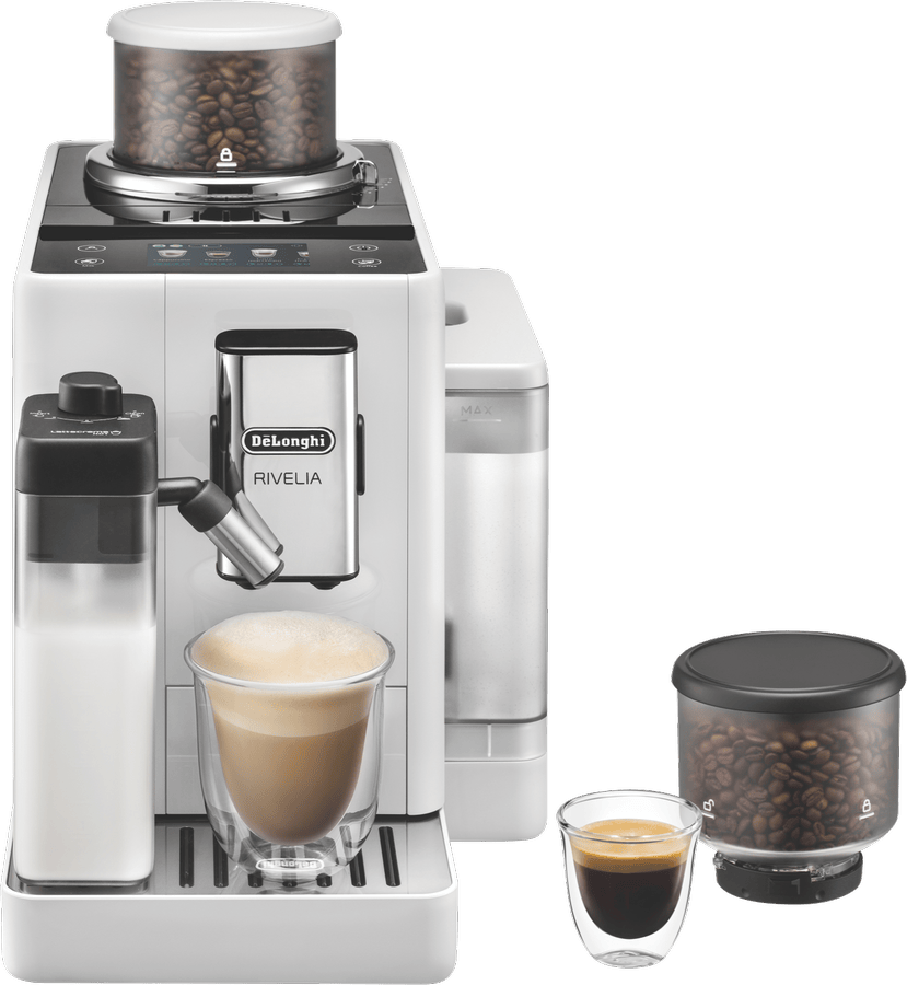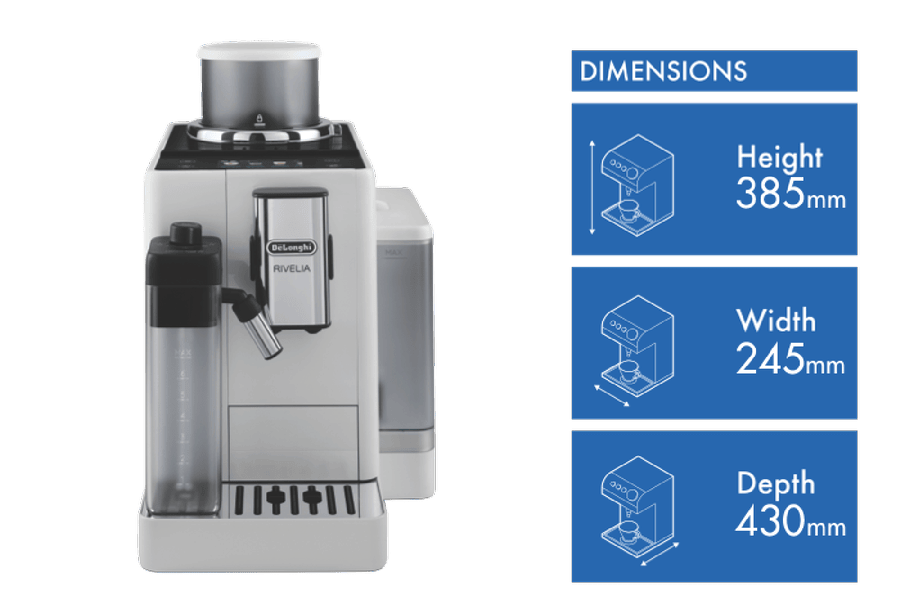Brew barista-quality coffee drinks at home with the DeLonghi Rivelia Fully Automatic Coffee Machine in Arctic White. This sleek fully automatic espresso machine delivers freshly ground beans and milk on demand for authentic cappuccinos, lattes and more with just the push of a button. The 19 bar pump pressure extracts maximum flavor from coffee grounds, while the interchangeable dual bean hoppers let you switch between two types of beans easily. Choose from 16 coffee and milk drinks like espresso, cappuccino, latte macchiato and more at the touch of a button. The built-in milk frother whips up silky smooth foam to top your drinks. With a 1.4 liter removable water tank, adjustable spouts and a digital display, this coffee machine takes the guesswork out of brewing while letting you customize your beverages. Designed for convenience, the Rivelia coffee machine features automatic cleaning and descaling functions to maintain performance. Measuring 385mm high, 430mm deep and 245mm wide, this compact countertop appliance weighs 9.7kg for easy placement in your kitchen. Covered by a 2 year manufacturer’s warranty, the DeLonghi Rivelia Fully Automatic Espresso Machine delivers cafe-quality coffee with push-button simplicity. EXAM44055W is the manufacturer’s part number for this product. Bring the joy of coffeehouse drinks home every day with this versatile machine.