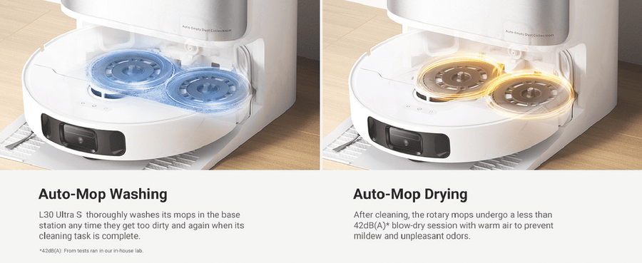 L30 Ultra S ensures comprehensive cleaning of hard-to-reach areas with MopExtendTM RoboSwing Technology. Its powerful 10,000Pa suction quickly picks up paper scraps, cat litter, dust, and hair. Keep pet areas clean, reduce manual cleaning, and minimize hair entanglement and ground moisture for healthier pets. Enjoy customized carpet cleaning, up to 75 days of auto-emptying, automatic mop-cleaning, hot air drying, and automated water refilling for weeks of hands-free cleaning. MopExtend RoboSwing Technology Effortlessly reach tight spots up to 4cm(1) deep by twisting and navigating around tables, chairs, and skirting boards, ensuring thorough dirt removal along edges. 13,000Pa(2) of Suction Power Unleash powerful 13,000Pa suction to tackle dirt and hair. The floating rubber brush easily manages hair, while ultrasonic carpet recognition and mop lifting enhance carpet and rug cleaning. Fully Automatic Base Station Maintain your robot vacuum effortlessly with 75 days(3) of auto-emptying, mop washing and drying, water refilling, solution adding. and more. Enjoy a truly hands-free cleaning experience like never before. Customized Carpet Cleaning Strategy L30 Ultra S offers multiple carpet cleaning modes, vacuum and mop, mop raising, intensive carpet cleaning and suction boost, carpet avoidance, and more. Letting you choose the best method for each carpet in your home. Disclaimers: (1) 4cm: Based on our in-house lab data. (2)13,000Pa based on our in-house lab data Actual performance may vary depending on the real world. (3)75 days: Based on a calculation derived from environment testing in our in house lab. Actual performance may vary depending on the real-world environment and usage