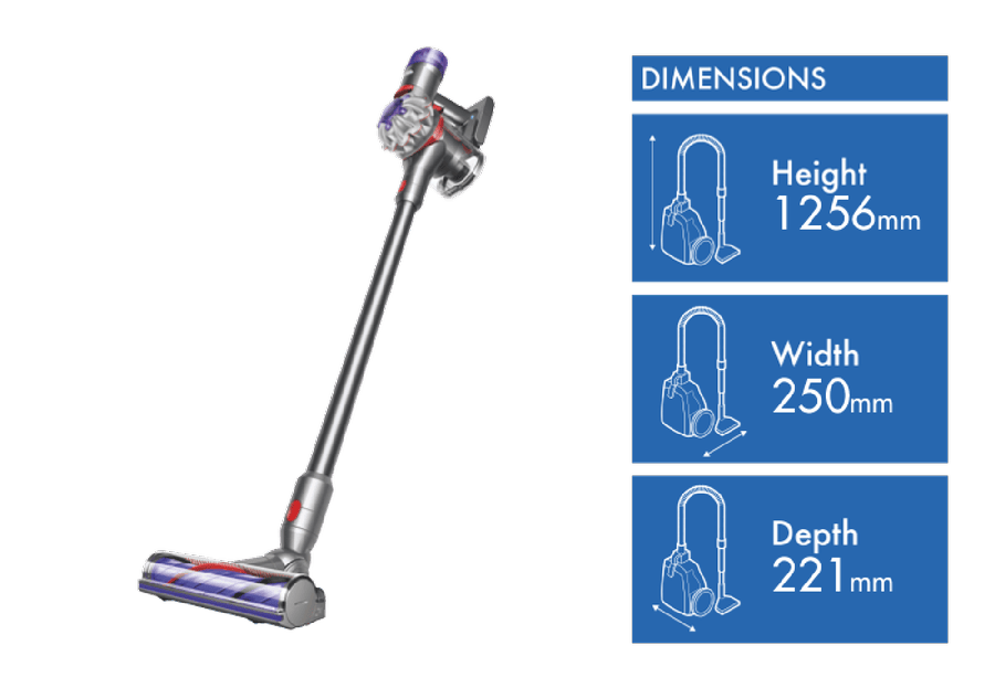 Dyson V8 Cordless Vacuum (394437-01) is powered by the Dyson digital motor V8, spins up to 107,000rpm to create powerful suction for versatile cleaning. Up to 40 minutes of fade free power(1). Whole machine filtration, captures 99.97% of particles down to 0.3 microns(2). Motorbar(TM) cleaner head has de-tangling vanes that automatically clear wrapped hair from the brush bar as you clean. Hair screw tool – Picks up hair. Fast. With Dyson anti-tangle technology. Hygienic bin emptying, no need to touch the dirt, just pull the lever to release it into your bin. Quickly transforms to a handheld vacuum cleaner, and back again, in just one click. Two power modes, switch between Max mode for up to 5 minutes of high power, and Powerful mode for longer, day-to-day cleaning. Lightweight and ergonomic, it easily reaches up high with one smooth motion. Disclaimers: (1) In powerful mode with non-motorised tools. (2) Filtration tested against ASTM F3150, tested in boost mode by independent third party, SGS-IBR Laboratories US in 2020