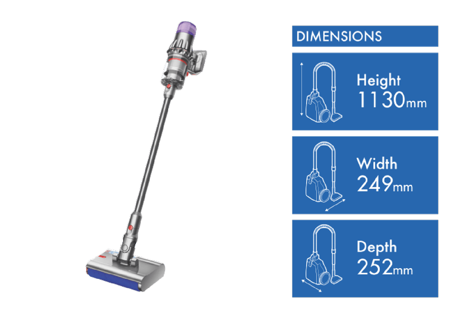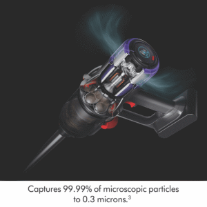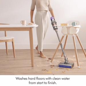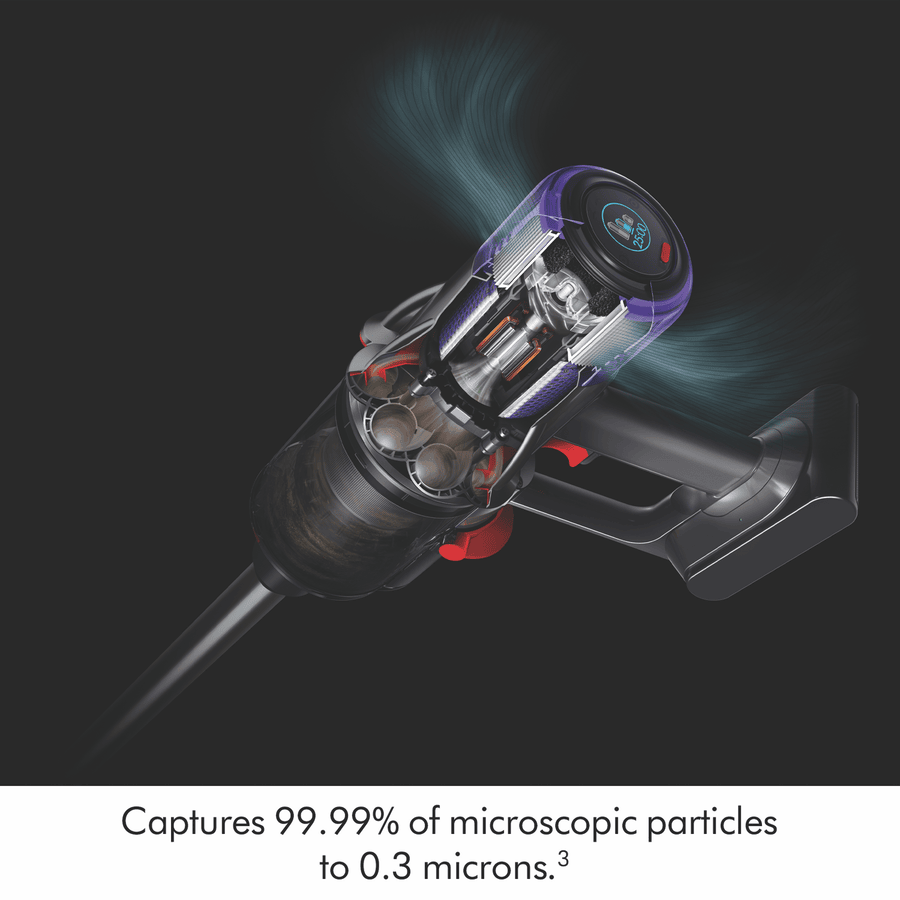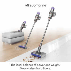 The Dyson V9 Submarine Cordless Vacuum 303946-01 is the ideal balance of power and weight that now washes hard floors. 100 Air Watts of fade-free suction(1), powered by a Dyson Hyperdymium motor spinning at up to 120,000rpm(1) with up to 40 minutes run time(2) across an advanced seven-cell lithium battery. The Submarine wet roller heads motorised microfibre roller washes spills and stains off hard floors, while the Motorbar cleaner head with Polycarbonate vanes lifts and spirals hair straight into the bin. The fully sealed whole machine filtration captures dust, particles and allergens to 0.3 microns up to 99.99%(3). Disclaimers: (1) Per ASTM F558-21 in Boost mode at the inlet. (2) In Eco mode. Run time may vary depending on usage and floor type. (3) Tested to ASTM F1977 on highest mode.