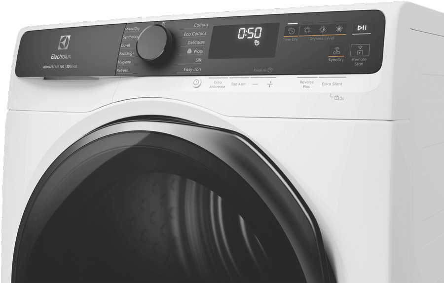 8kg UltimateCare 700 heat pump dryer with 9 star energy efficiency. Wi-Fi enabled, featuring Woolmark Blue certification, advanced 3DSense technology, refresh cycle, and reverse tumbling action