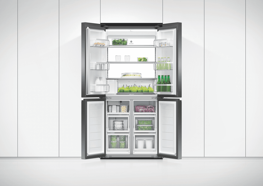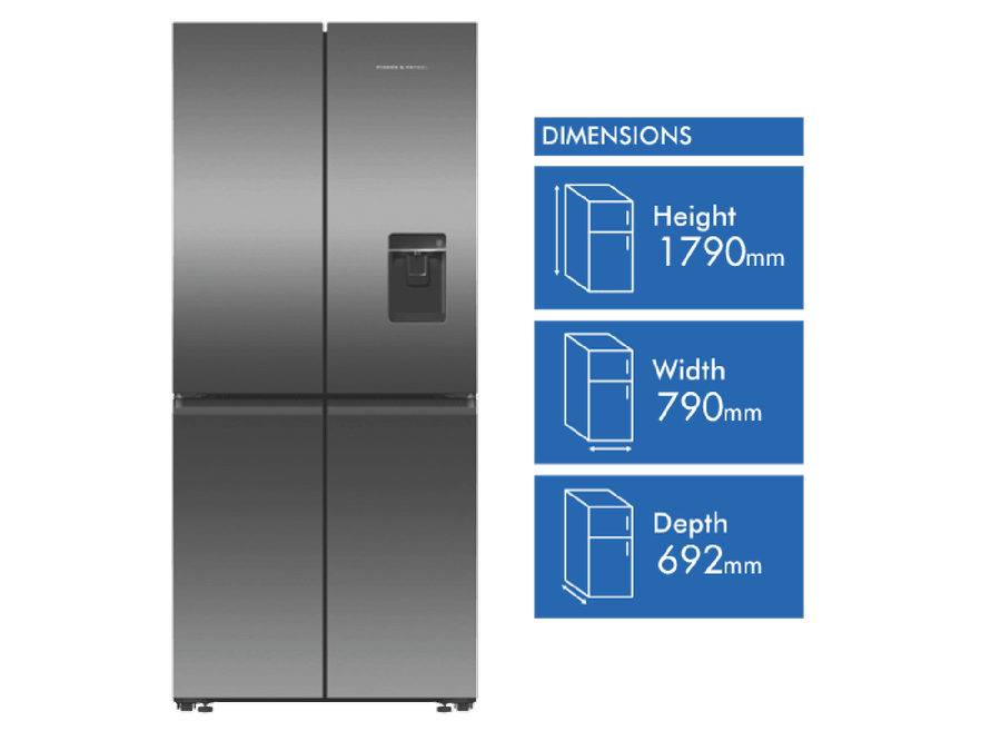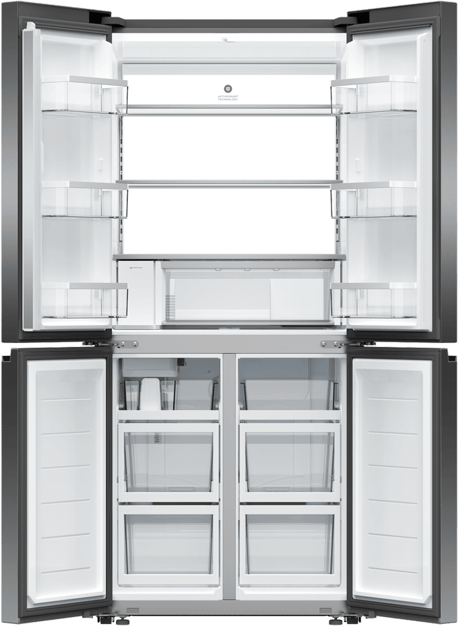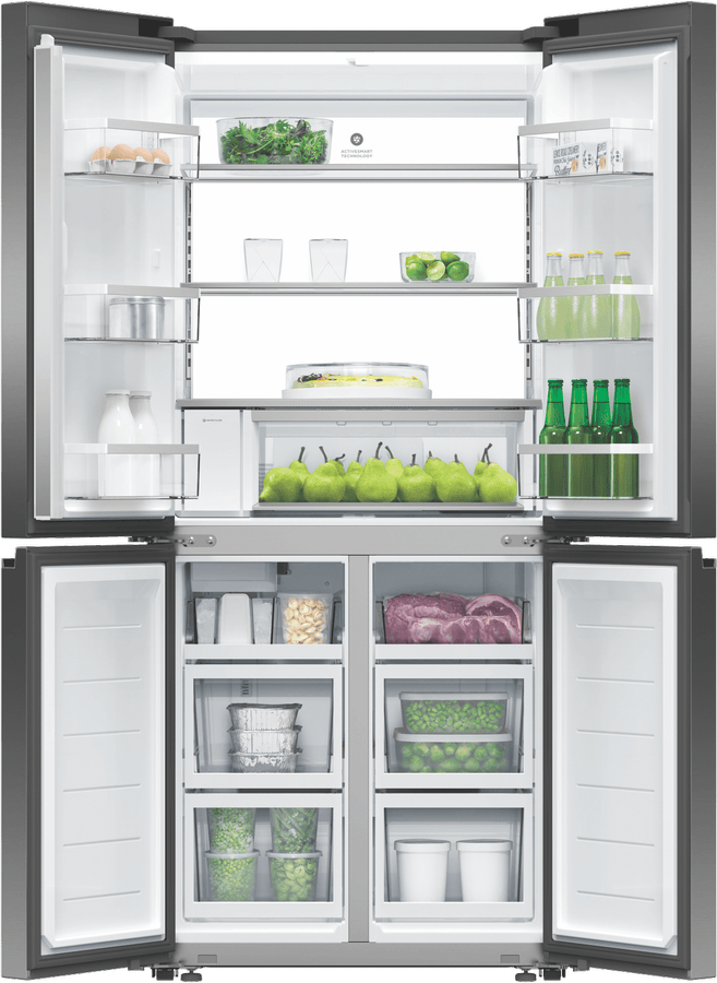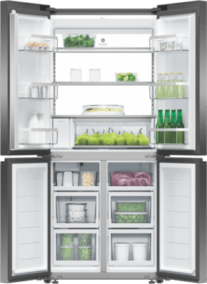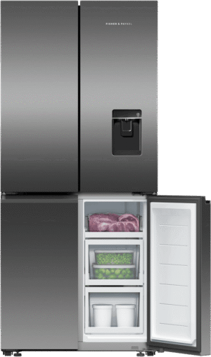 Keep your food fresh and organized with the Fisher & Paykel 498L Quad Door Refrigerator. This spacious fridge features four doors and flexible storage options to fit all your family’s needs. The sleek black stainless steel finish adds a modern touch to any kitchen. With a total capacity of 498 litres, including a 324 litre fridge and 174 litre freezer, you’ll have plenty of room for all your groceries. The fridge’s ActiveSmart technology adjusts cooling based on usage patterns for optimum food preservation. Dual humidity controlled bins keep fruit and veggies crisp, while the ice and water dispenser delivers refreshing chilled water and ice on demand. Wi-Fi connectivity lets you control and monitor your fridge from your smartphone. This fridge’s energy rating of 4.5 stars means it operates efficiently to help reduce your energy bills. For convenient access throughout the day, this Fisher & Paykel fridge has dual opening doors. Bring stylish and functional refrigeration into your home with the Fisher & Paykel 498L Quad Door Fridge. The manufacturer’s part number for this product is RF500QNUB1.