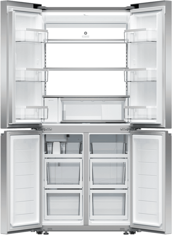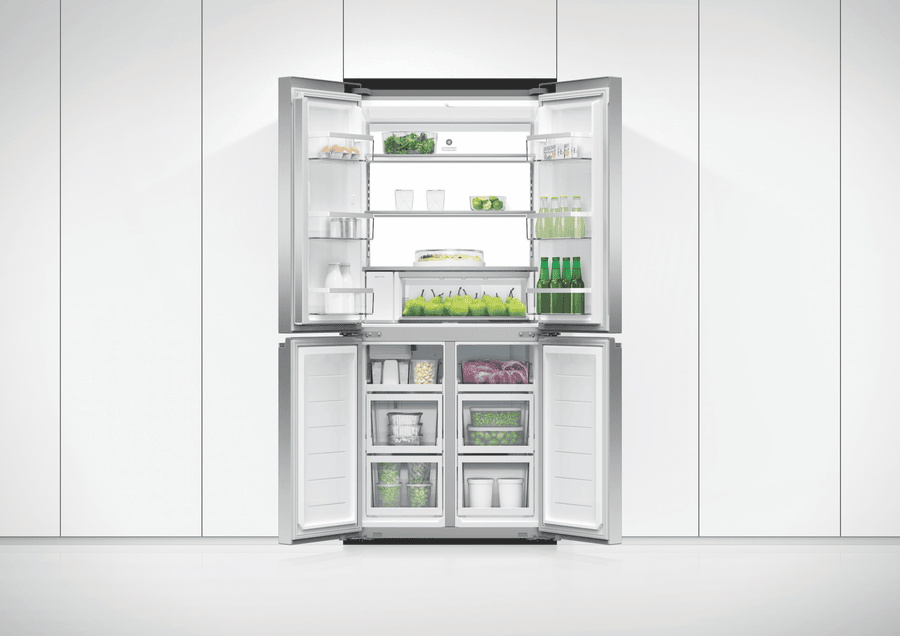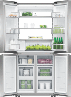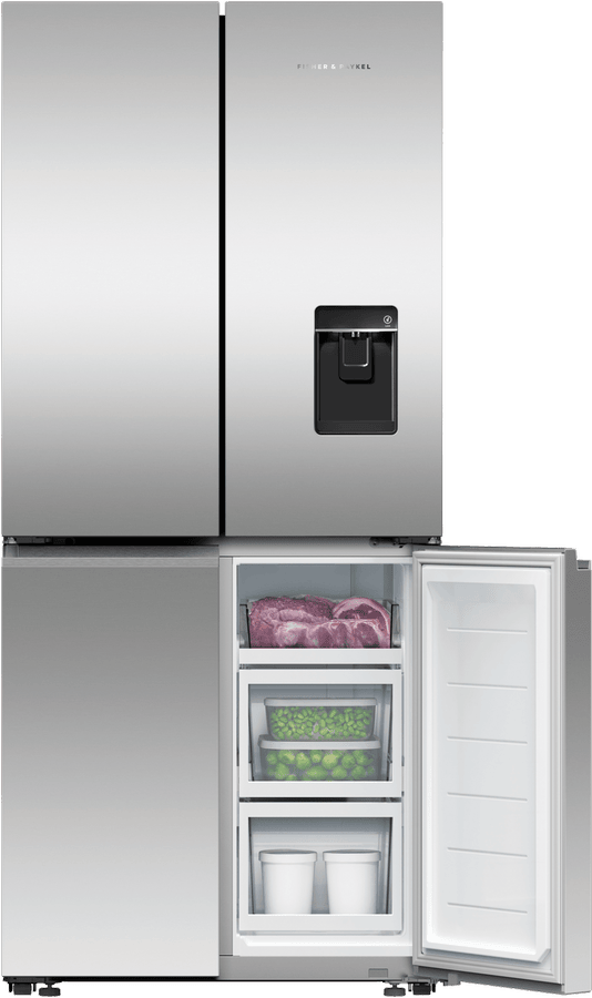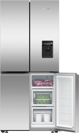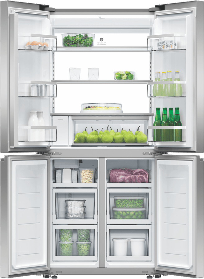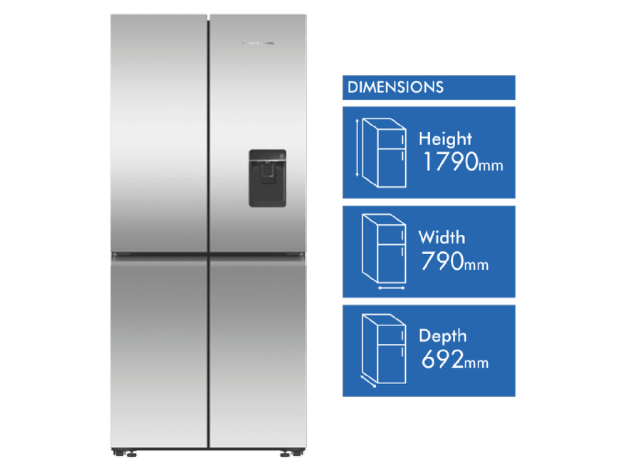 Refresh your kitchen with the sleek, modern style of the Fisher & Paykel 498L Quad Door Refrigerator. This French door fridge comes loaded with flexible storage solutions and smart technology to keep your food fresher for longer. The quad door design provides easy access and ample space for all your storage needs with a 324L fridge capacity and a 174L freezer capacity. The ActiveSmart Foodcare system, Wi-Fi connectivity, and humidity controlled bins work together to monitor conditions and adjust cooling to maintain optimal freshness. With a spacious 790mm width, 1790mm height, and 692mm depth, this fridge accommodates bulk grocery hauls and tall drink bottles with ease. The ice and water dispenser delivers chilled filtered water and ice on demand. Rated an energy efficient 4.5 stars, this Fisher & Paykel fridge combines innovative food preservation with minimal environmental impact. The stainless steel finish and silver fridge colour allow this appliance to blend seamlessly into your kitchen’s existing decor. Give your groceries the advantage of smart refrigeration with the Fisher & Paykel 498L Quad Door Fridge. The manufacturer’s part number for this product is RF500QNUX1.