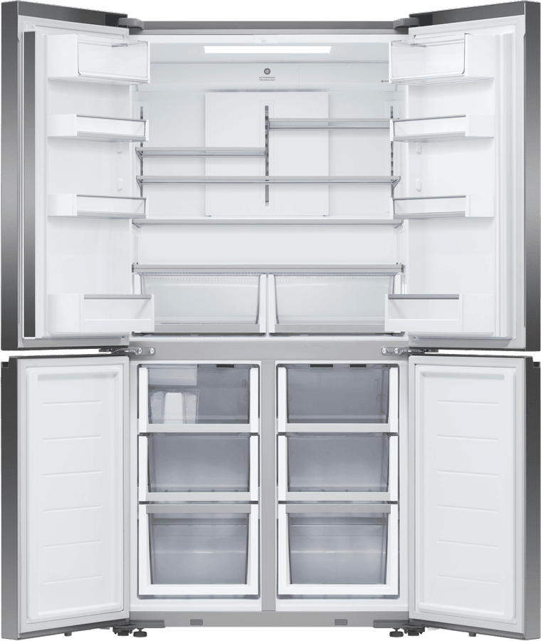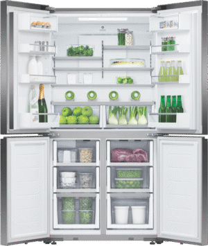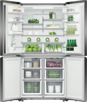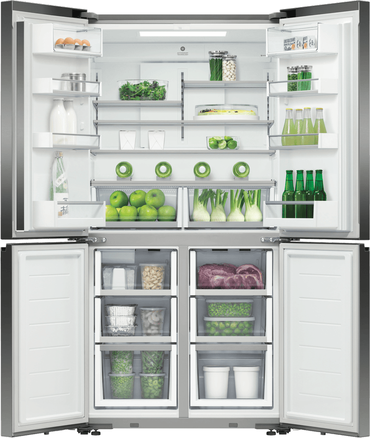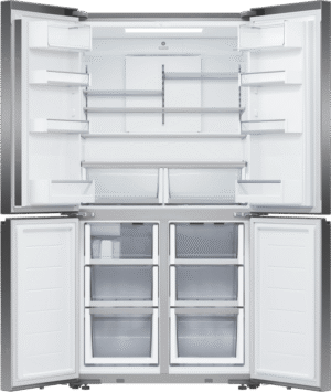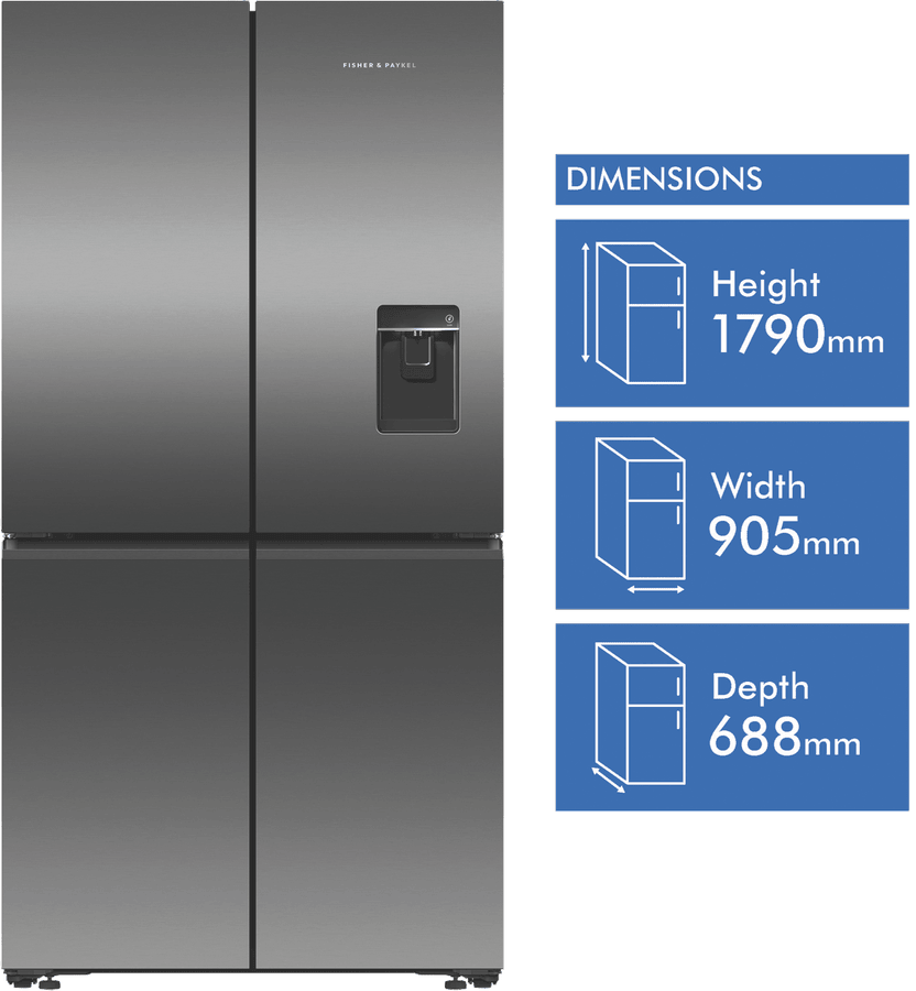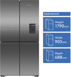 Step up to a more spacious way of refrigeration with the Fisher & Paykel 538 litre Quad Door French Door Refrigerator in classic Black stainless steel. Boasting a generous 538 litre total capacity, this quad door fridge provides ample storage for the weekly shop and extras. The sleek Black stainless steel finish adds a modern touch to your kitchen. Inside you’ll find 341 litres of fridge space and 197 litres of freezer capacity, providing room for all your fresh and frozen favourites. Dual hinged doors give easy access from either side. The auto ice and water dispenser eliminates refilling ice trays and makes filtered water readily available with just the press of a lever. Rated an energy efficient 4 stars, this large capacity fridge helps cut electricity costs. Part of Fisher & Paykel’s premium Series 7 range, this quad door refrigerator offers advanced cooling technology and flexible storage solutions. With a width of 905mm, height of 1790mm and depth of 688mm, it fits most kitchen spaces while making an elegant style statement. Bring home the convenience of more space for food and drinks with the Fisher & Paykel 538 litre Quad Door Fridge. The manufacturer’s part number for this product is RF605QNUVB1. Take a closer look at this Fisher & Paykel refrigerator for your kitchen today.