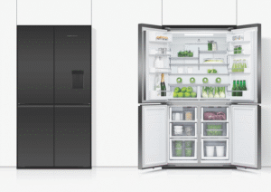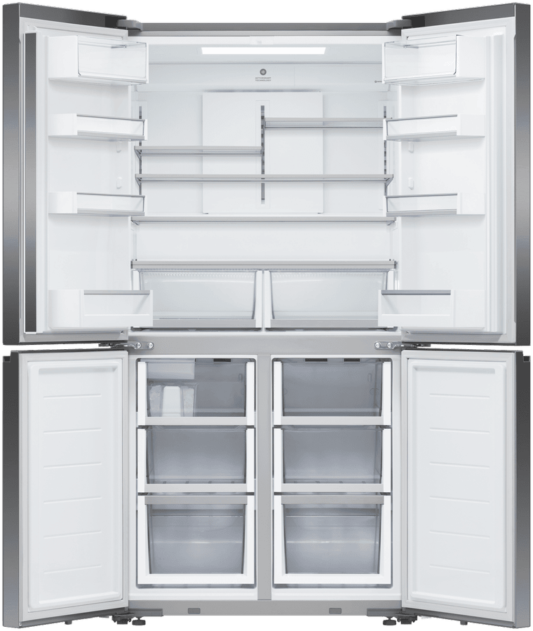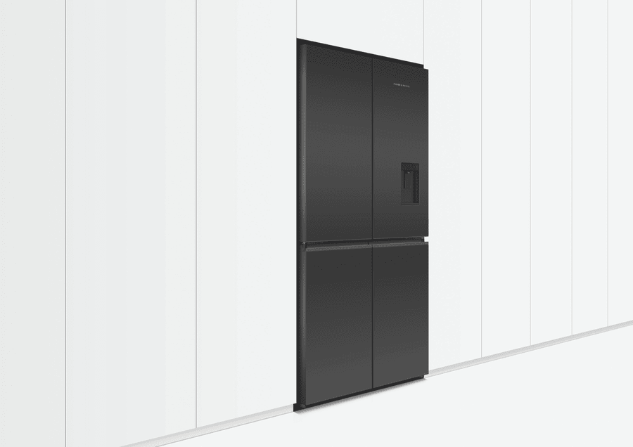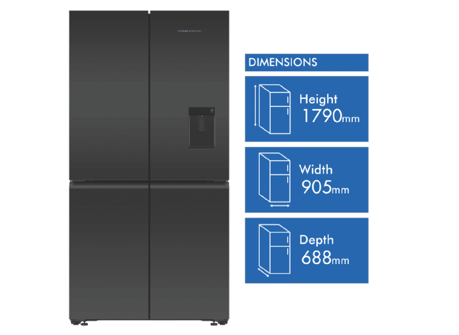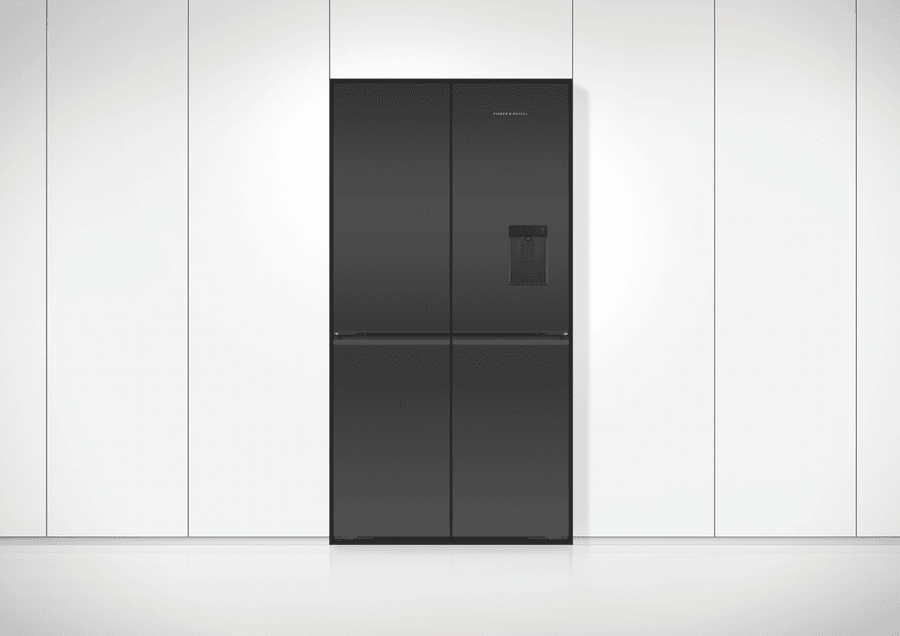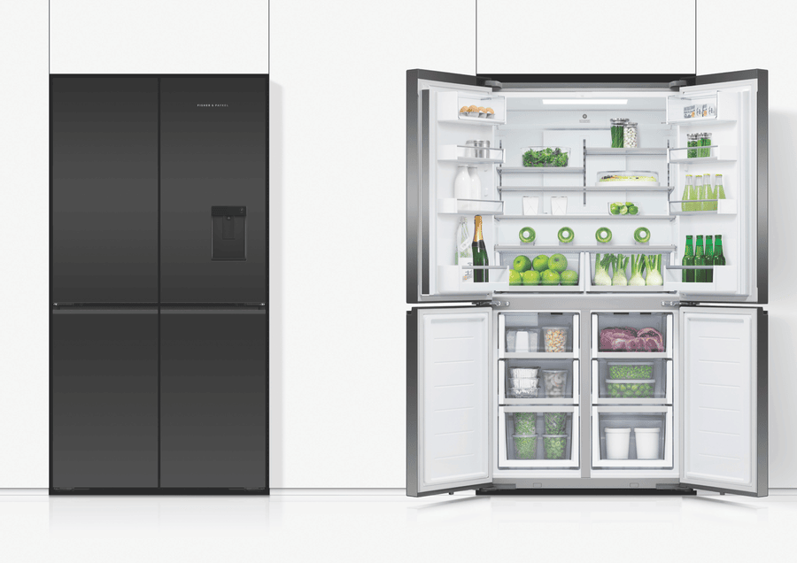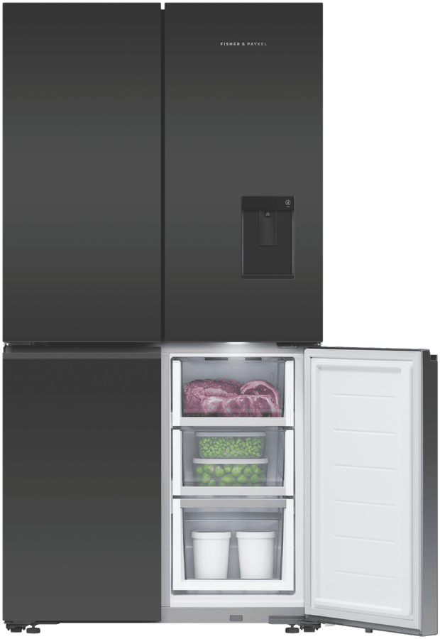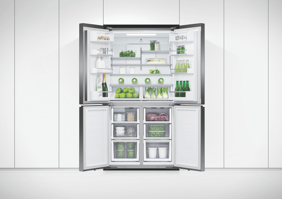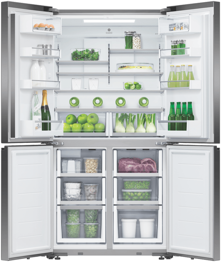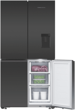 Store your food and drinks for nights of dinner entertainment, or simply organise your week shopping in the expansive and spacious Fisher & Paykel 538L Quad Door Refrigerator RF605QZUVB1. Variable Temperature Zones give you the control to look after the wide variety of food you purchase; simply select a setting and the adjustable lower right compartment will change to suit your refrigeration needs, convert this section into a freezer, soft freezer, chiller, or normal fridge to maximise your fridge possibilities. Chill Mode helps to keep your favourite meats, fish, and poultry cool while maintaining its taste and freshness for three times longer than fridge mode. Also, its perfect for easily chilling beverages for a prefect summer day refresher. Soft Freezing takes the work out of defrosting your frozen food; it maintains the perfect temperature for your storing necessary ingredients or easily grabbing a bite of some delicious snacks. Let your Fisher & Paykel fridge manage the condition of the interior capacity; ActiveSmart Foodcare adjusts the temperature, airflow, and humidity to maintain the freshness and taste of your food and drink for longer. Quality design comes hand in hand with refrigeration efficiency; robust and quality materials, stainless steel exteriors, glass interior shelving, recessed handles and black glass finishes creates a luxurious and high end appliance that’s perfect for all modern kitchen decors. Always have ice available to you, using the easy to use Ice Maker; use it during the hot summer months to cool down and turn it off when you require more freezer space.