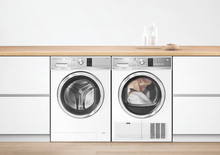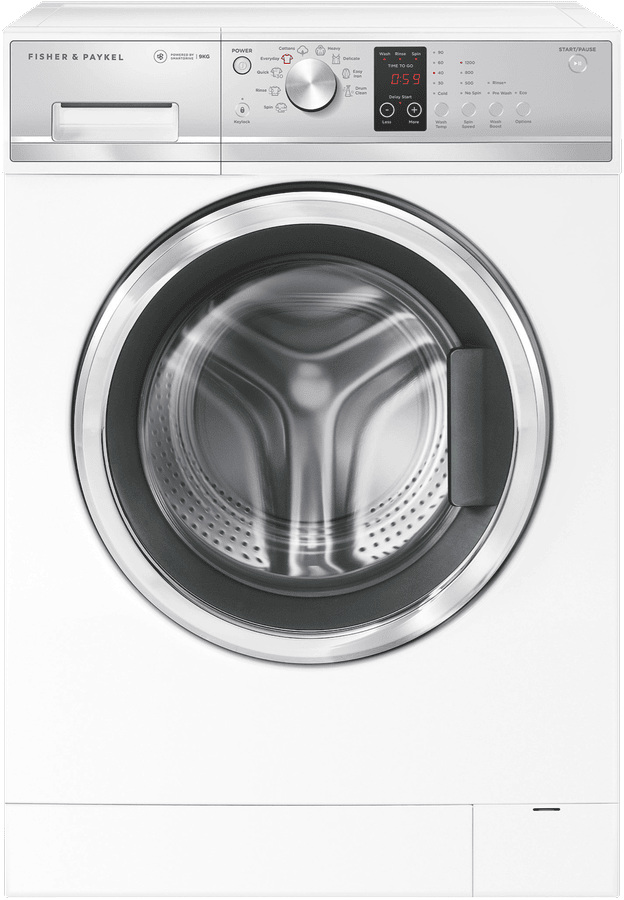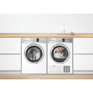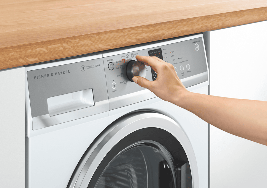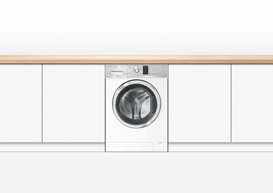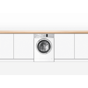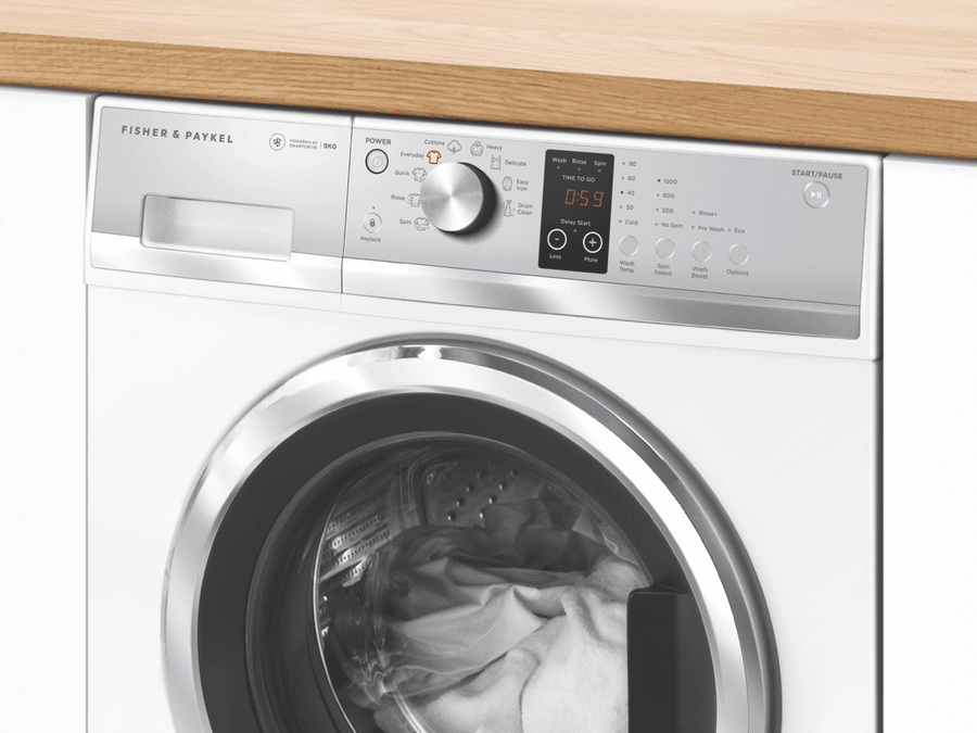 This white Fisher & Paykel 9kg Front Load Washer WH9060J3 features SmartDrive technology to detect the size of the load for intelligent water and energy use, while fewer moving parts ensure a quiet wash. It has a 4.5 Star WELS Water Rating and 4 Star Energy Rating for savings at bill time. Select from nine wash cycles including a 30-minute Quick cycle for lightly soiled loads of up to 6kg. The high 1200rpm maximum spin speed powerfully extracts water after washing so your laundry takes less time to dry. This white front load washing machine is 850mm high, 600mm wide, and 655mm deep, so carefully measure the space where you want your washer to go and make sure there’s enough room for the door to open and for a dryer to be wall-mounted above if you want to save floor space.