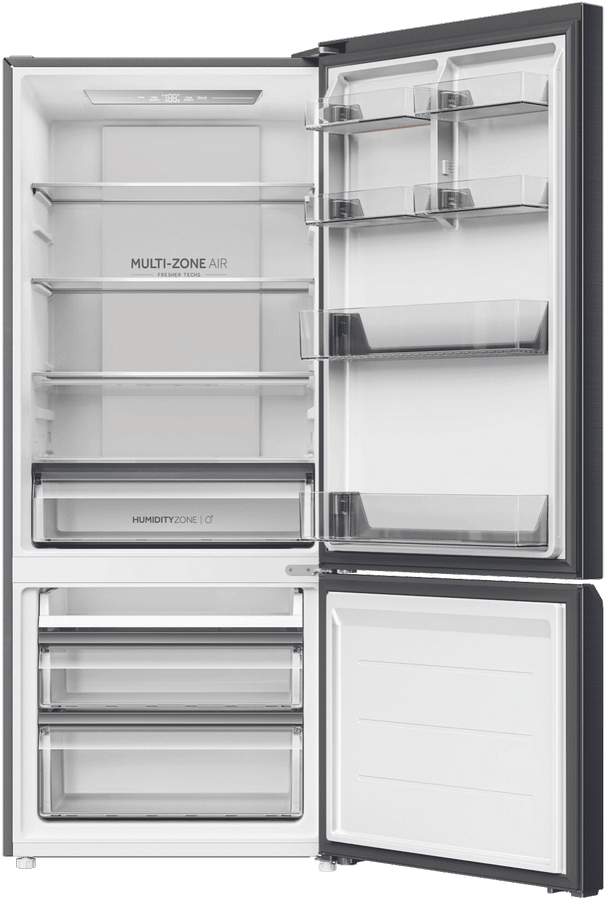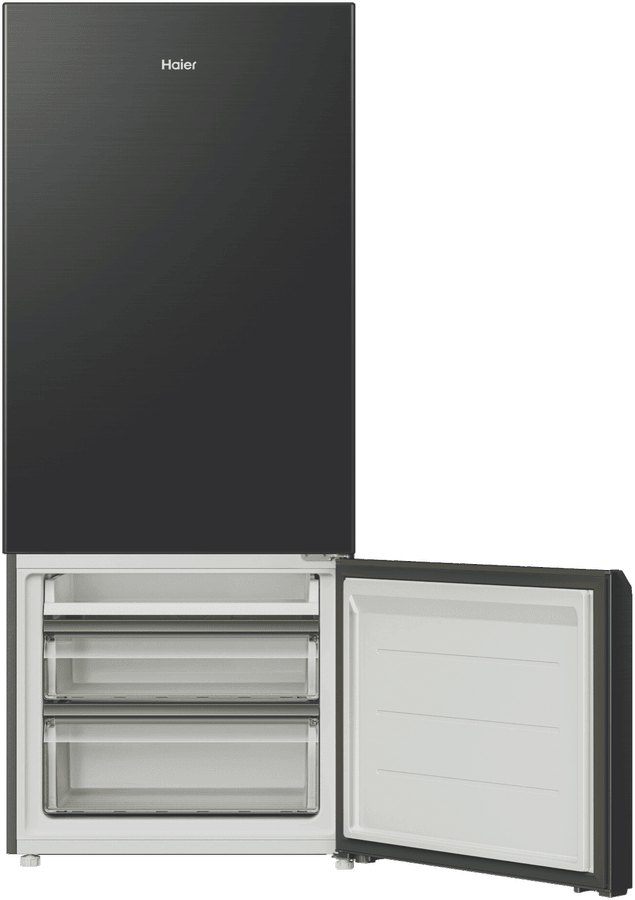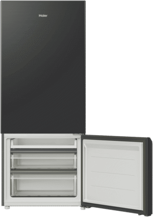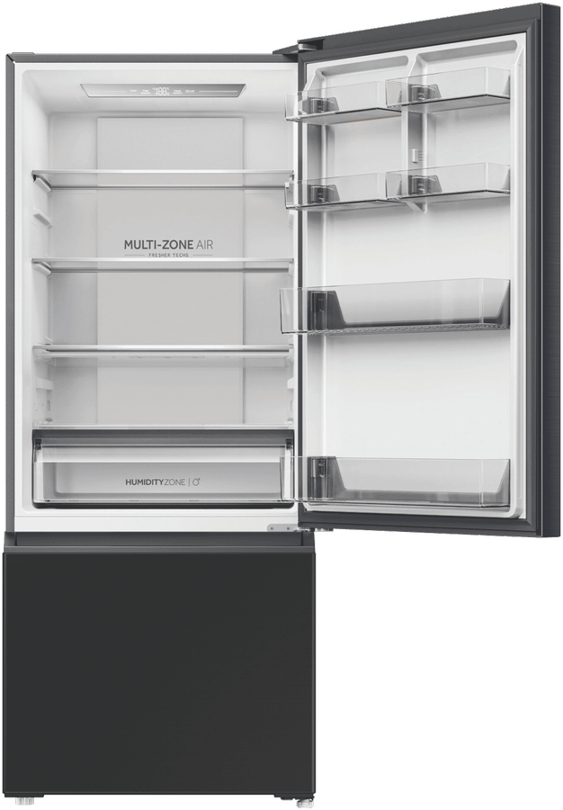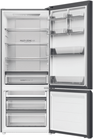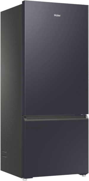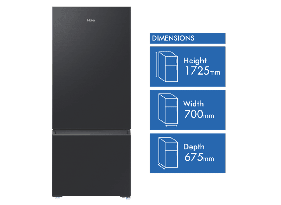 Bring home spacious and flexible refrigeration with the Haier 433L Bottom Mount Refrigerator. This fridge comes with a sleek black finish that will seamlessly blend into your kitchen decor. The generous 433 litre total capacity includes a large 321 litre fridge compartment and a 112 litre freezer, providing ample storage solutions for all your fresh and frozen foods. The bottom mount design ensures easy access to frequently used fridge items, while keeping frozen foods within easy reach below. Dual hinged doors and reversible door swing cater to both left and right opening preferences. Interior features like Humidity Zone, Multi-Zone Air and Super Freeze ensure optimised conditions for storing all types of food. The 5.5 star energy rating significantly reduces running costs while the fingerprint resistant finish simplifies cleaning. With separate temperature controls for the fridge and freezer, you can customise cooling as needed. Recessed handles and a smooth black finish give this refrigerator a minimalist, modern look.At 700mm wide, 1725mm high and 675mm deep, this freestanding fridge is designed to fit most kitchen spaces. It comes with a 2 year manufacturer’s warranty for peace of mind. The manufacturer’s part number for this product is HRF420BC. Check out the Haier 433L Bottom Mount Refrigerator for high capacity refrigeration with flexible storage and energy efficient performance.