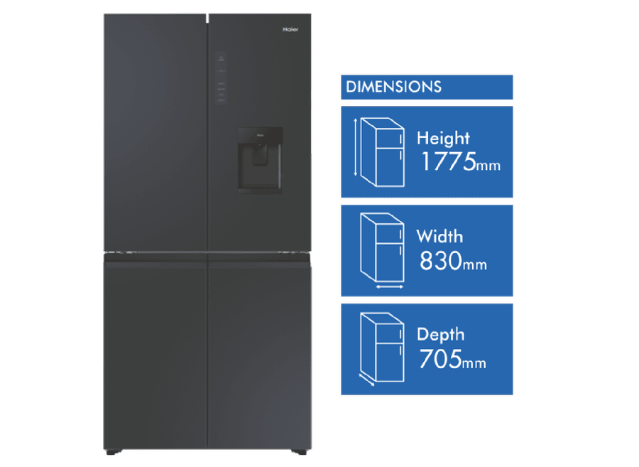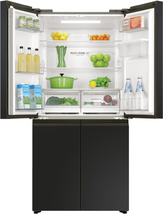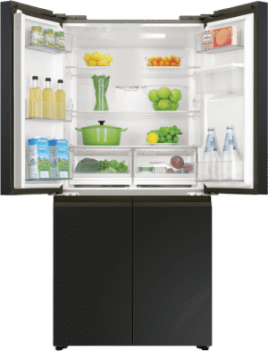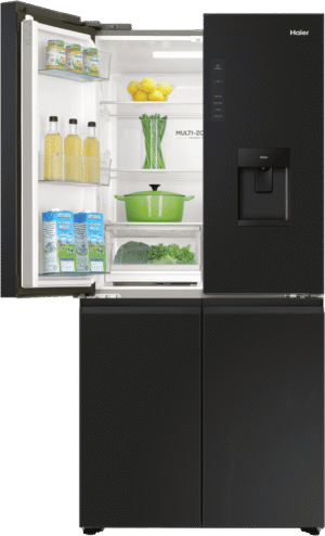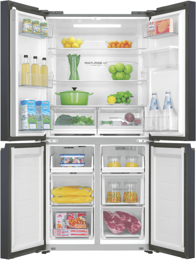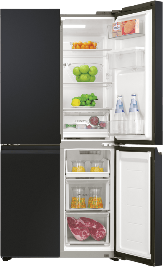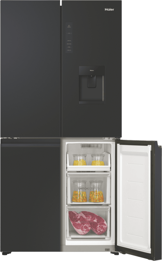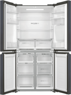 Keep your fresh and frozen foods in optimal condition and neatly organised thanks to this Haier 508L Quad Door Refrigerator HRF580YHC. Flexible storage solutions include two adjustable glass shelves to make room for fresh produce, drinks and everyday essentials, as well as Haier’s SwitchZone allowing you to switch between fridge and freezer in the bottom right compartment with a temperature range of between -18°C to +5°C. This Haier fridge has an efficient 4.5 Star Energy Rating, a water dispenser, and MultiZone Air cooling for effective airflow and maximum freshness throughout.