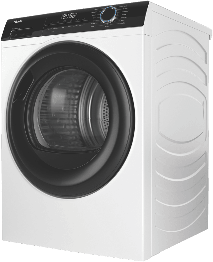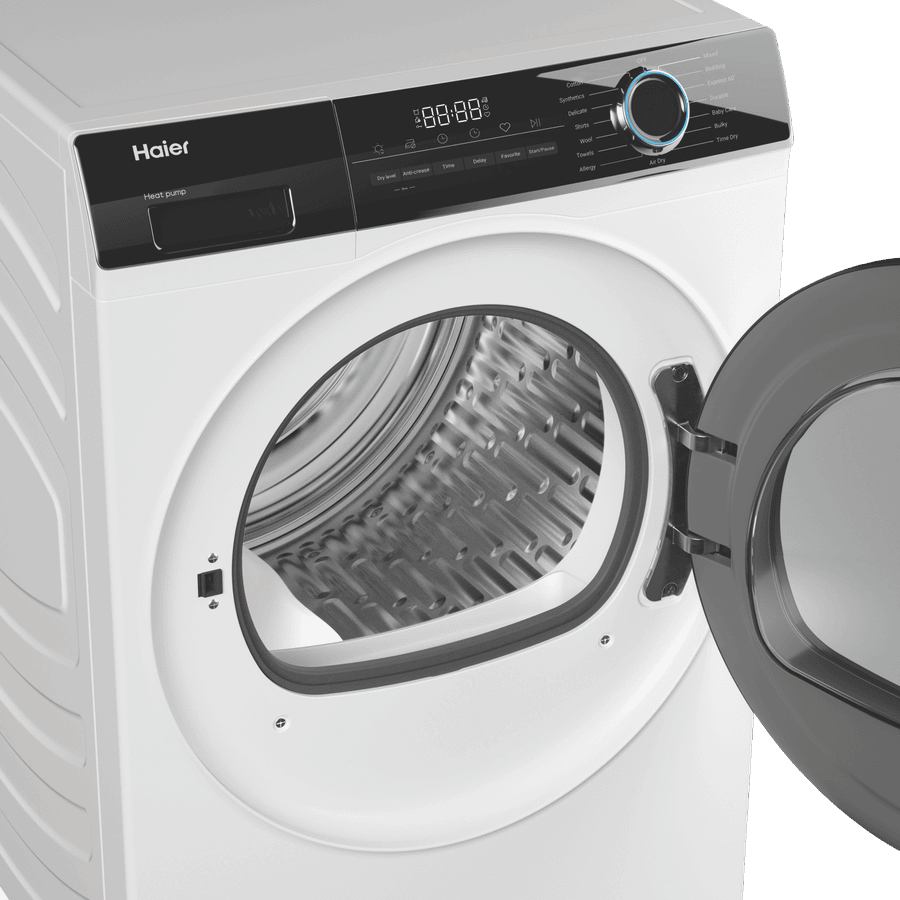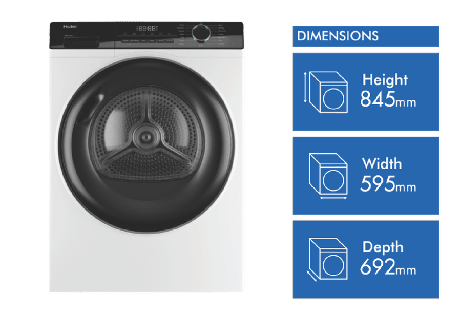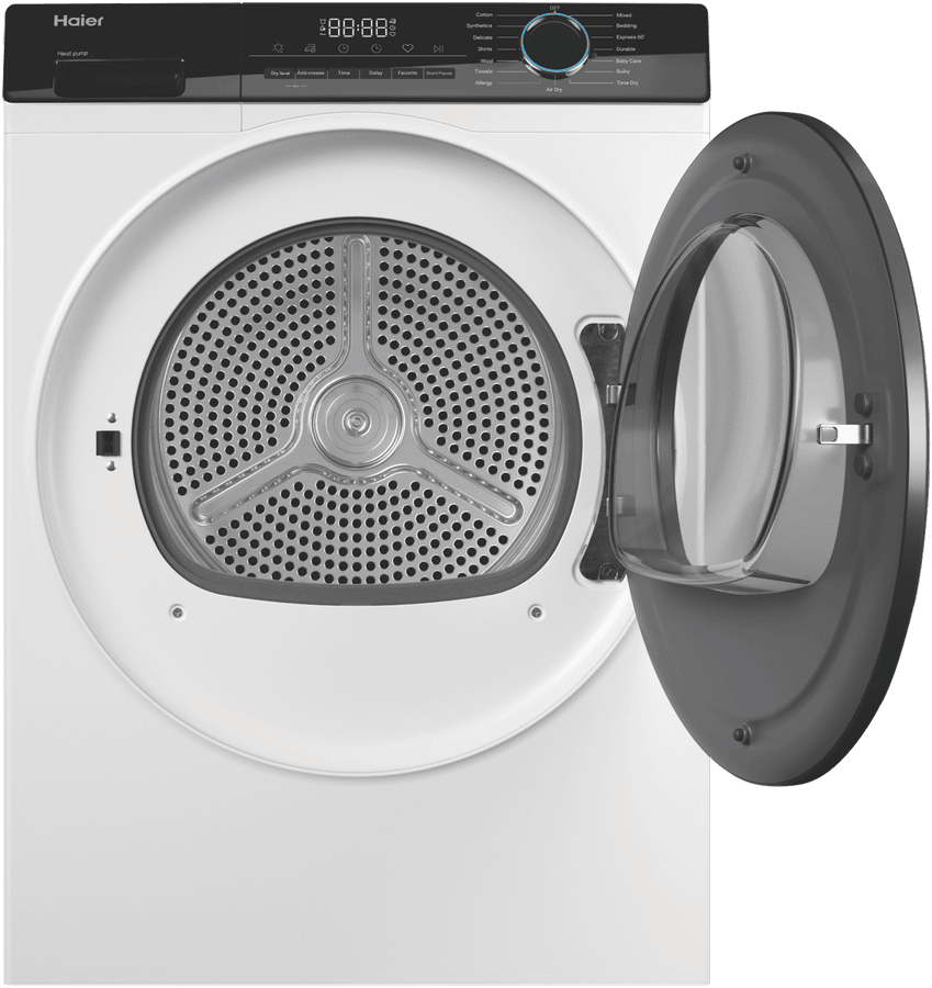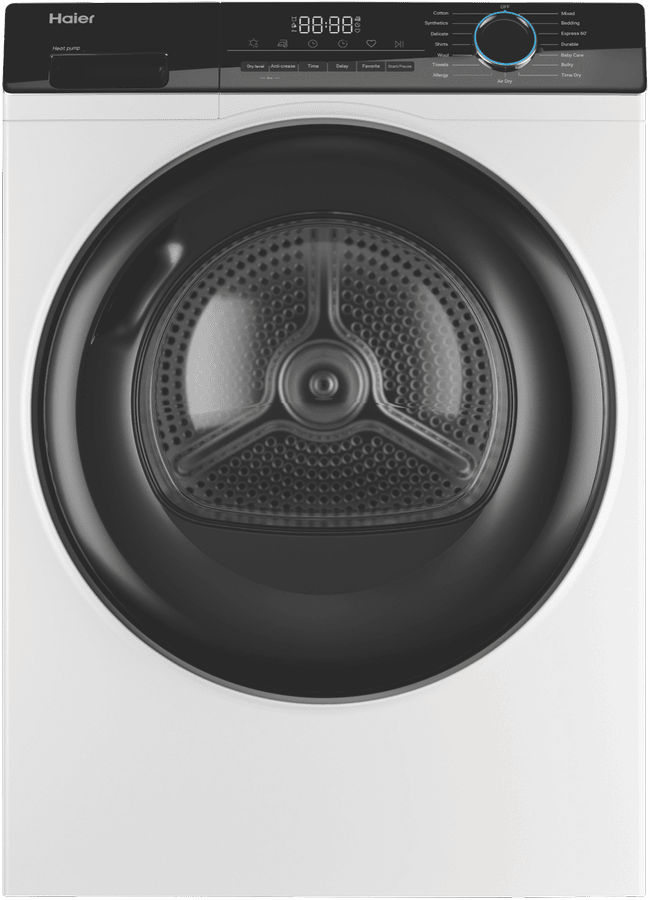 Bring the power of a heat pump dryer home with the Haier 8kg Heat Pump Dryer HDHP80AW1. This white clothes dryer dries up to 8kg of laundry at a time, making it perfect for medium-sized households. With its 8 star energy rating, it’s designed for efficient drying to help reduce your energy bills. The heat pump system recirculates hot air to dry clothes gently without the need for external venting, making installation straightforward. With 15 tailored drying programs like Air Dry, Delicate, Wool, and Baby Care, this dryer caters to all your laundry needs. It features options like Sensor Drying with auto moisture sensing to prevent over-drying, as well as Dryness Level settings of Damp, Dry or Extra Dry. The stainless steel drum is gentle on fabrics. At 595mm wide, 845mm high and 670mm deep, it’s sized to fit well in the laundry. Adjustable feet allow you to level it properly on uneven floors. A handy end-of-cycle signal alerts you when your laundry is ready. With intuitive controls, including a Keylock function, it’s simple to operate. Enjoy the convenience of a dryer designed to make laundry day easy.Backed by a 2 year manufacturer’s warranty for peace of mind, the Haier 8kg Heat Pump Dryer HDHP80AW1 makes an ideal choice for any home. Contact us to learn more about this innovative dryer today. The manufacturer’s part number for this product is HDHP80AW1.