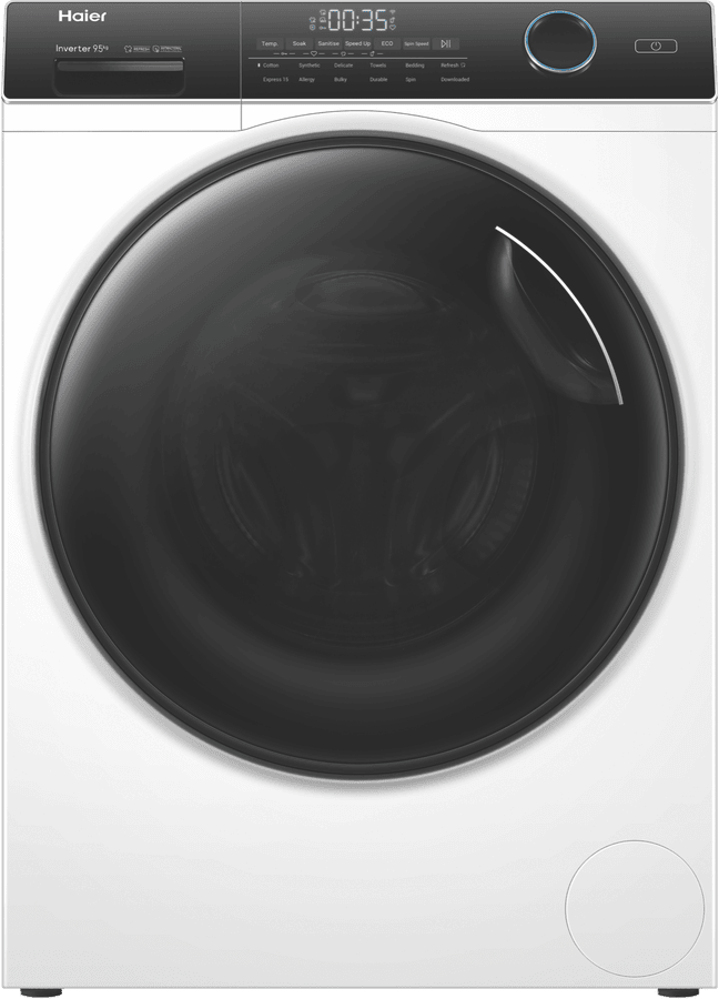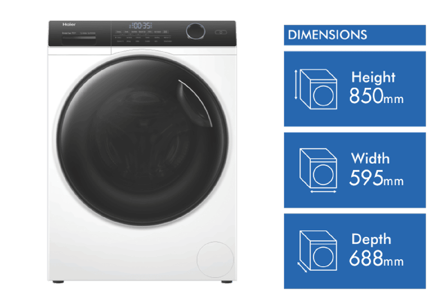 Tackle laundry piles in no time with the powerful Haier 9.5kg Front Load Washer. This sleek white washing machine delivers an impressive 1400rpm max spin speed to quickly dry loads. The large 9.5kg capacity allows you to wash more in a single load, saving you time. Stay in control with the 12 flexible programs like Refresh, Express 15 and Speed Up. The Anti-Bacteria Treatment in the gasket and detergent dispenser prevent nasty odors. Connect via WiFi to remotely monitor cycles. The energy efficient 4 star rating and impressive 4.5 star WELS water rating save resources. With a spacious 595mm width, 850mm height and 688mm depth, it fits most laundry spaces. The manufacturer’s part number for this product is HWF95AN1. Invest in this durable front loader knowing it’s backed by a 2 year warranty for peace of mind.