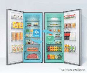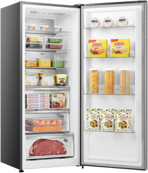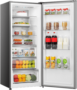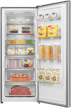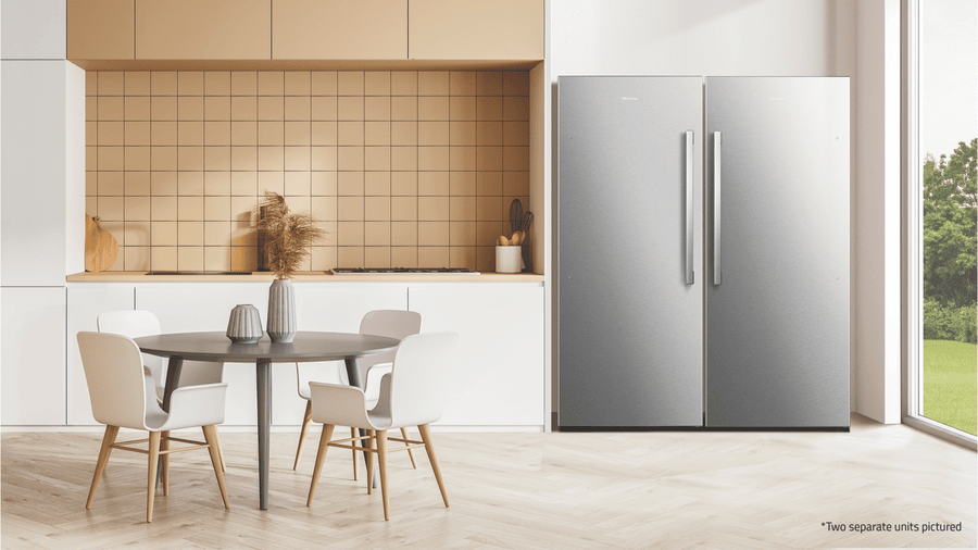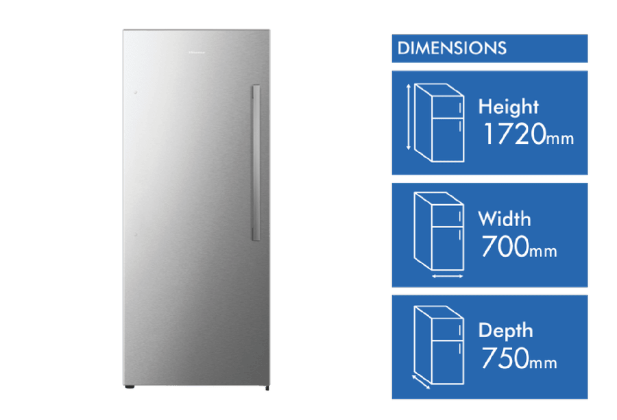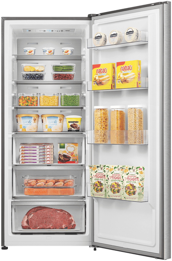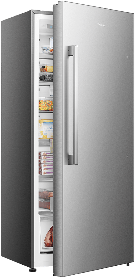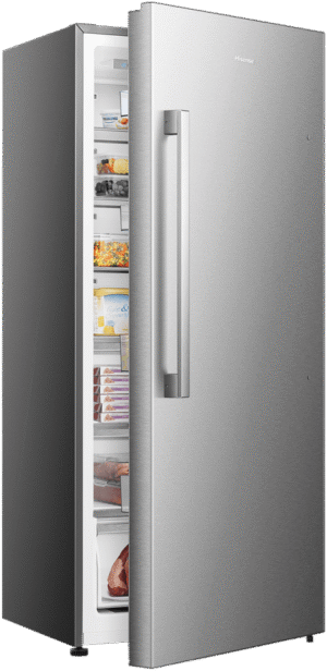 Discover a smart and spacious way to store your frozen foods with the Hisense 384L Vertical Hybrid Freezer. With its sleek silver finish and reversible door, this upright freezer blends seamlessly into any modern kitchen. The generous 384-liter capacity provides ample room for bulk frozen goods and meal preps, while the Total No Frost system prevents icy buildup for fuss-free maintenance. Switch effortlessly from freezer to fridge with the innovative switchable cooling system. Electronic touch controls and modes like Super Freeze boost freezing power at the touch of a button. Hisense backs this freezer with a 3 year warranty, so you can rely on its durable stainless steel construction. And with its energy-efficient 3 star rating, you can save on electricity bills while still enjoying ice-cold frozen foods. The Hisense 384L Vertical Hybrid Freezer brings intelligent freezing and storage to your home. The manufacturer’s part number for this product is HRVF384S. Discover the convenience of bulk frozen storage today.