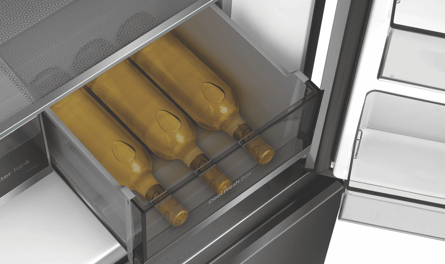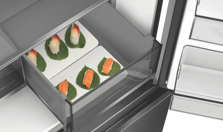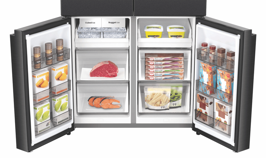 Want a fridge that’s big on space and smart features? This Hisense 640L French Door Fridge has room for all your groceries and then some. With a huge 390L fridge and 121L freezer, plus a 129L multi-use zone, you can store everything from party platters to frozen pizzas. The cool fresh box keeps fruits and veggies crisp, while the dual ice maker means you’ll never run out of ice for drinks. No need to hook up plumbing – the built-in water dispenser has a 5L tank. The UV sterilization keeps things hygienic, and the sliding shelf makes grabbing items easy. With a 4.5 star energy rating, it’s efficient too. The sleek dark stainless steel finish looks great in any kitchen. Backed by a 3 year warranty, this fridge (model HRCD640TBW) is a reliable choice for busy families.
