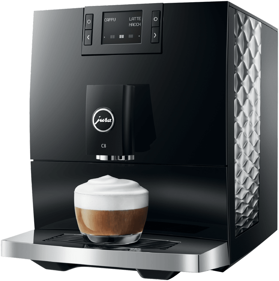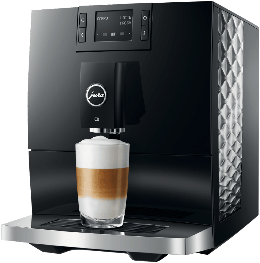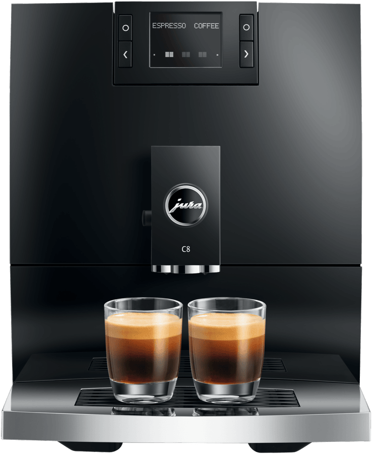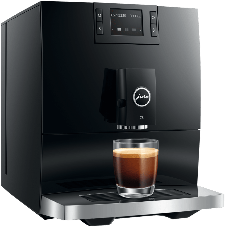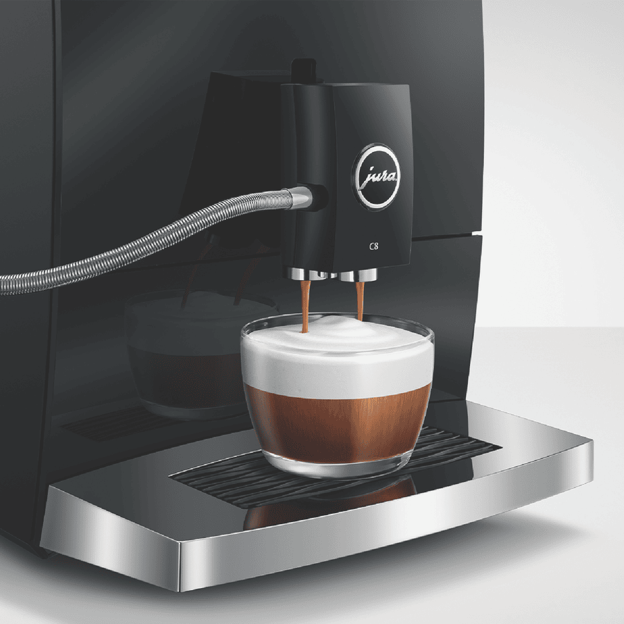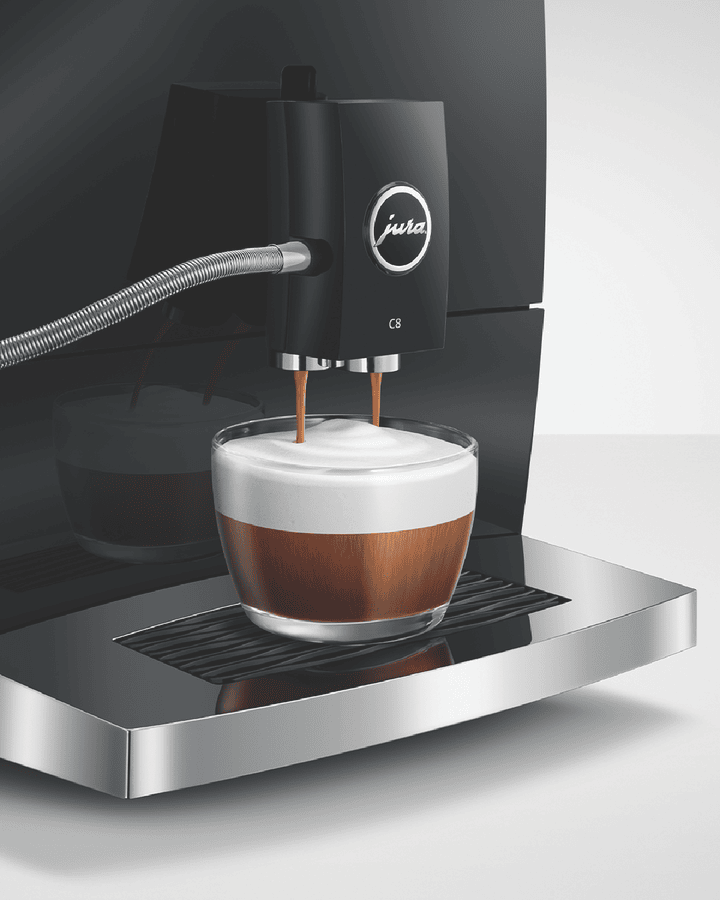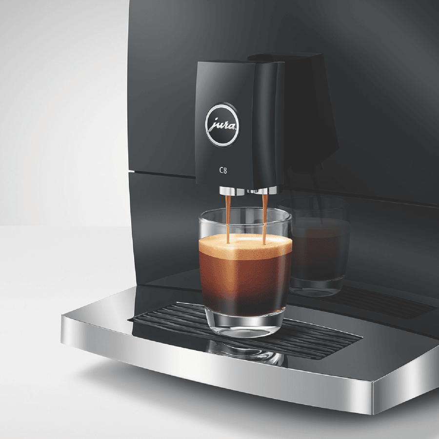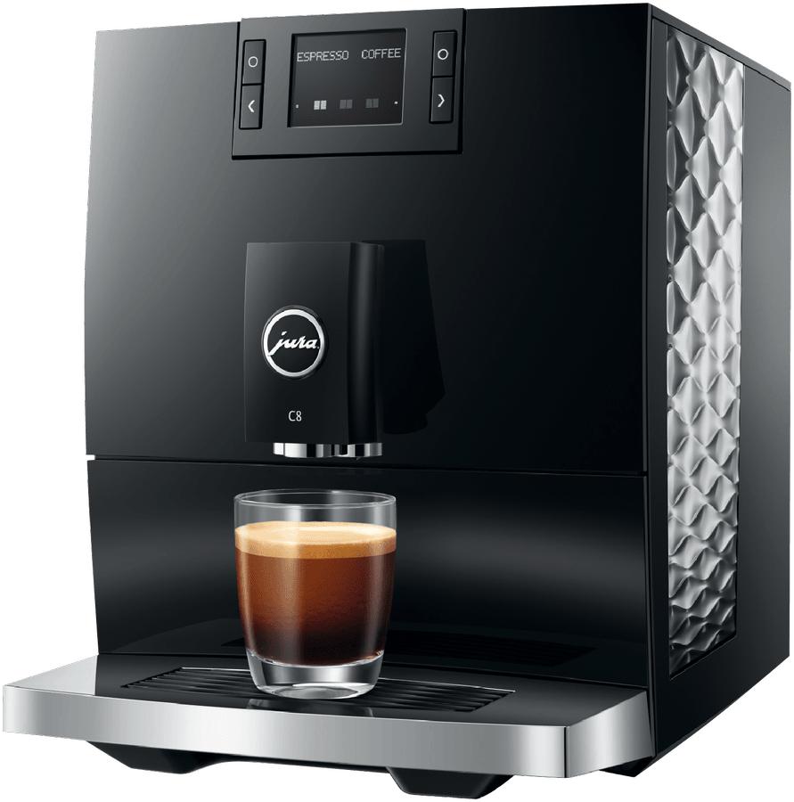 Make barista-quality coffee at home with this Jura C8 automatic coffee machine. Its powerful 15 bar pump and built-in grinder transform fresh beans into six specialty drinks including espresso, cappuccino and latte macchiato. The 1.6 litre water tank and 200g bean container let you brew multiple cups without constant refilling, while the thermoblock heating system ensures your coffee is always the perfect temperature. The intuitive touchscreen makes selecting your perfect brew simple, and you can even control it remotely using the Jura app. Includes energy-saving auto shut-off and a 2-year warranty. Model 15690.