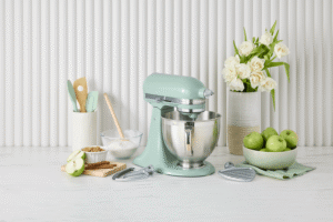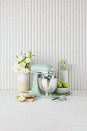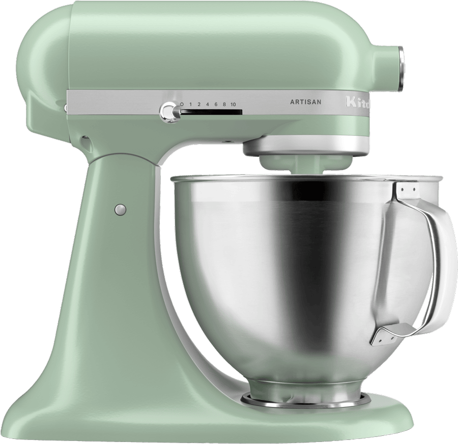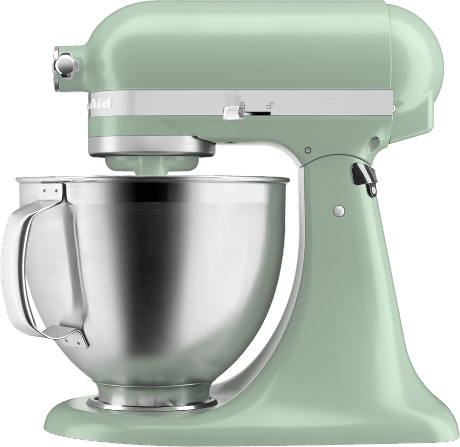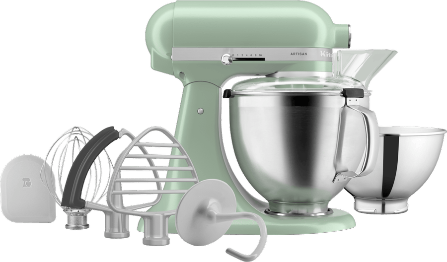 Bring professional baking power to your kitchen with the KitchenAid Artisan Stand Mixer in elegant Cardamom green. This full metal stand mixer features 10 speed settings and a generous 4.7L bowl capacity, perfect for making up to 9 dozen cookies at once. The tilt-head design makes adding ingredients simple, while planetary mixing ensures everything is thoroughly combined. With included accessories like two stainless steel bowls (4.7L and 2.8L), whisk, flex edge beater, pastry beater, dough hook and pouring shield, you’re ready for any recipe. Backed by a 5-year warranty. Model 5KSM195PSADC.