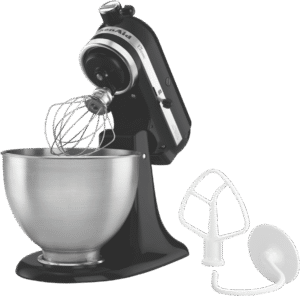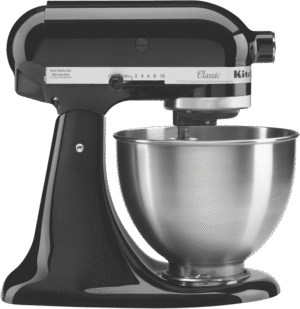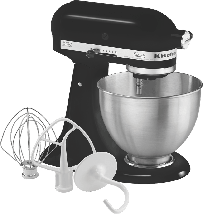 Discover the power of a classic with the KitchenAid Onyx Black Classic Stand Mixer. This iconic mixer is crafted with a durable metal die cast construction and features the planetary mixing action that KitchenAid is known for, allowing the beater to touch 67 different points in the bowl for fast, thorough mixing. With 10 speed settings and a 4.3L stainless steel bowl, you can mix, knead and whip ingredients with ease. The locking tilt-head design provides convenient access for attaching accessories. This versatile mixer comes equipped with essential attachments including a flat beater, wire whisk, and dough hook. Weighing 11.5kg, it has a sturdy build that will stand the test of time. The 5 year manufacturer’s warranty provides peace of mind. Bring home the timeless KitchenAid Classic Stand Mixer in a sleek Onyx Black finish and unlock endless possibilities in your kitchen today. The manufacturer’s part number for this product is 5KSM45AOB.