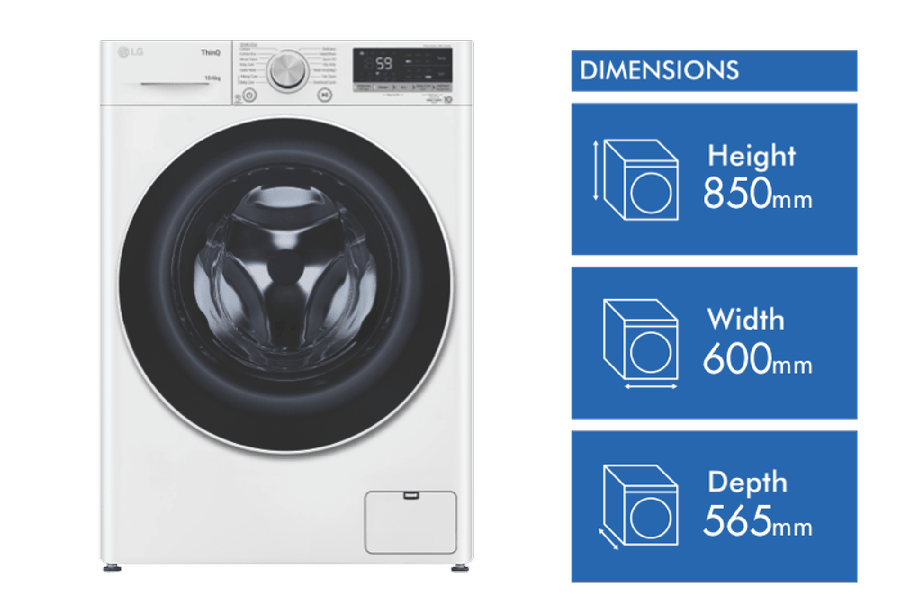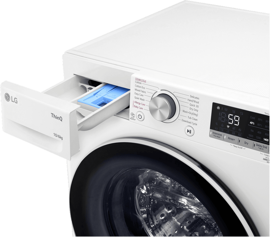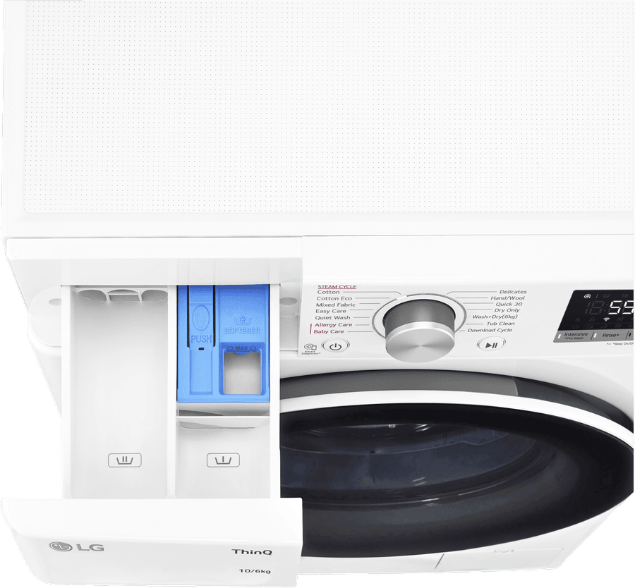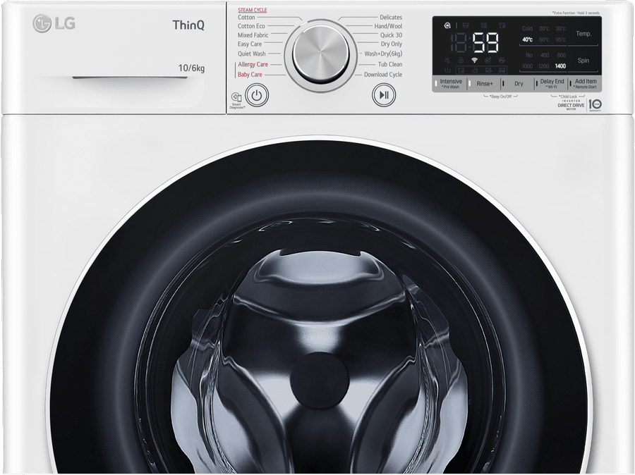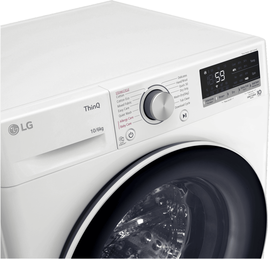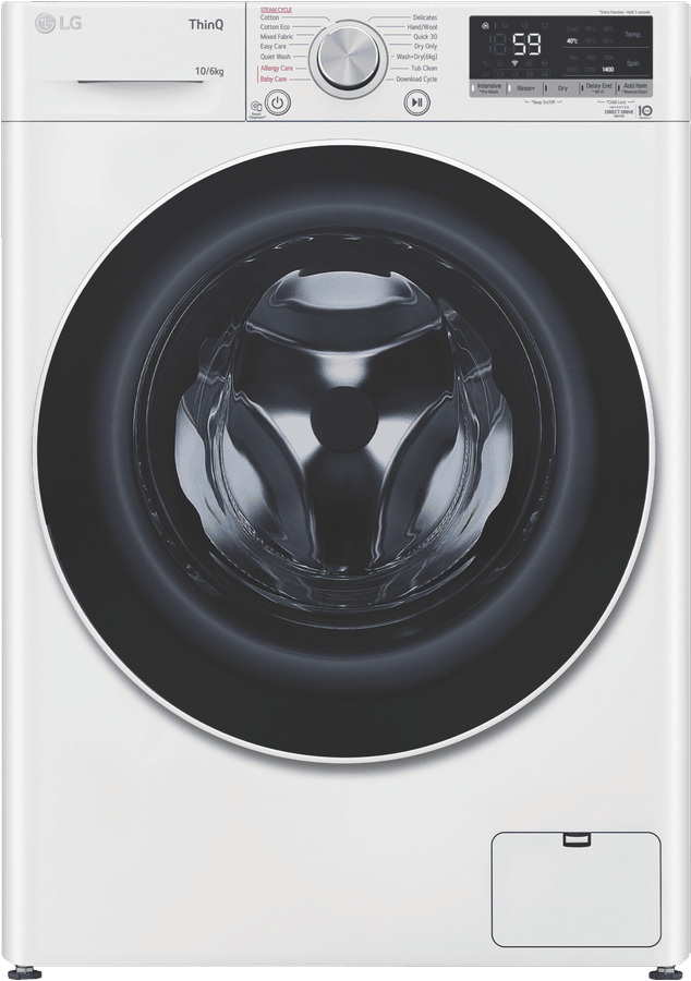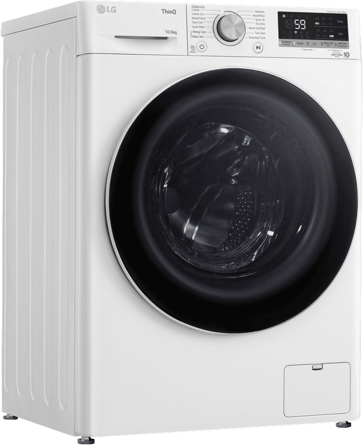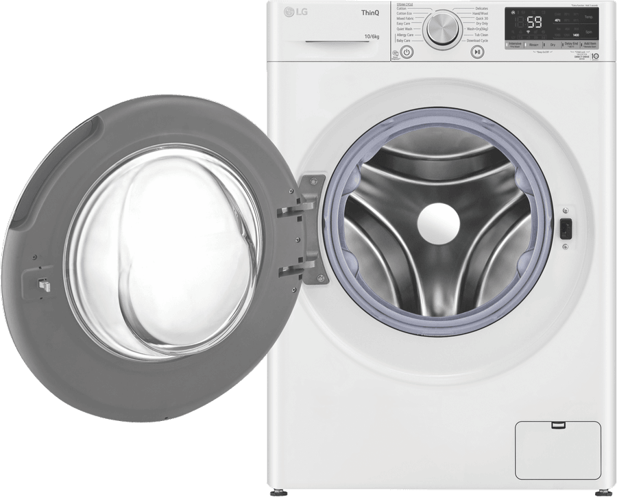 The LG 10kg-6kg Combo Washer Dryer is the all-in-one solution for effortlessly cleaning your clothes. With a large 10kg washing capacity and 6kg drying capacity, this front loading washing machine combo takes the hassle out of laundry day. The sleek white finish complements any home decor while the 15 versatile wash programs handle everything from daily loads to delicate fabrics. Key features include a fast 1400rpm spin speed, an energy-efficient 4.5 star water rating, and LG’s AI-powered Intelligent Fabric Care technology to optimize every cycle. Additional capabilities like Steam Refresh and Allergy Care provide specialized care for your wardrobe. The expansive drum offers ample room for bulky items, while the 6 Motion Direct Drive system gently cleans with reduced noise and vibration. Monitor and control cycles remotely with LG ThinQ. This combo washer dryer makes doing laundry simple. With its durable build, smart features and fabric-protecting performance, this appliance will keep your clothes looking their best for years to come. The manufacturer’s part number for this product is WVC5-1410W. Bring home the efficiency and convenience of the LG 10kg-6kg Combo Washer Dryer today.