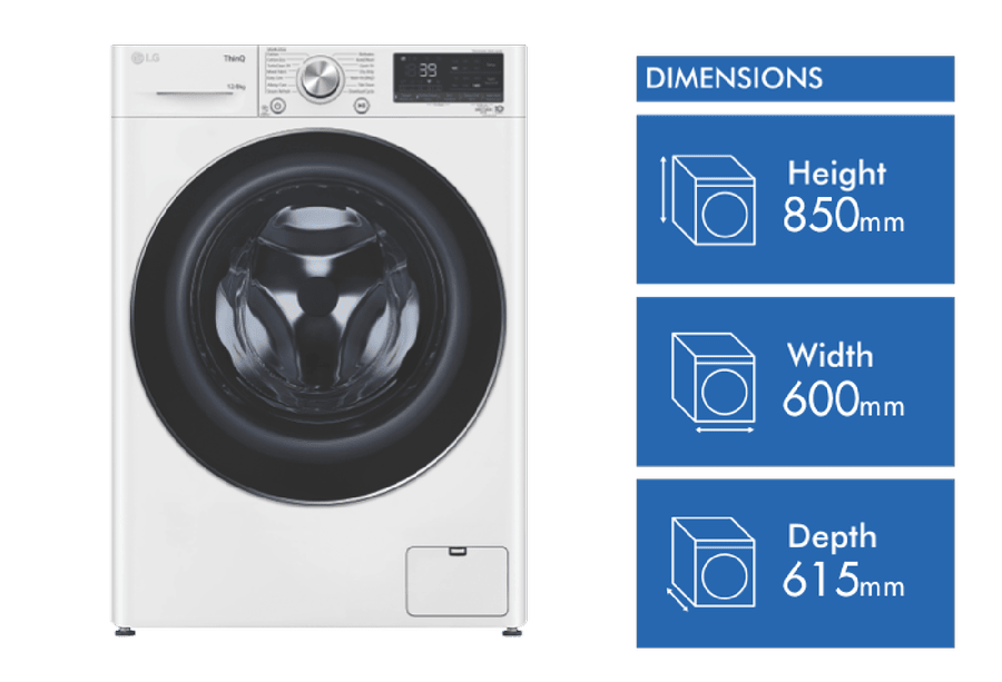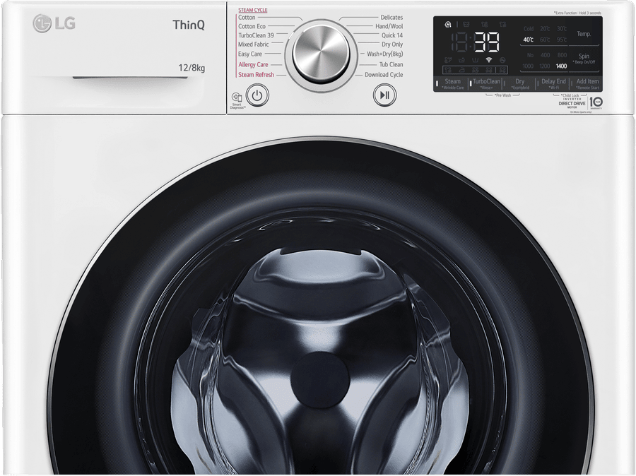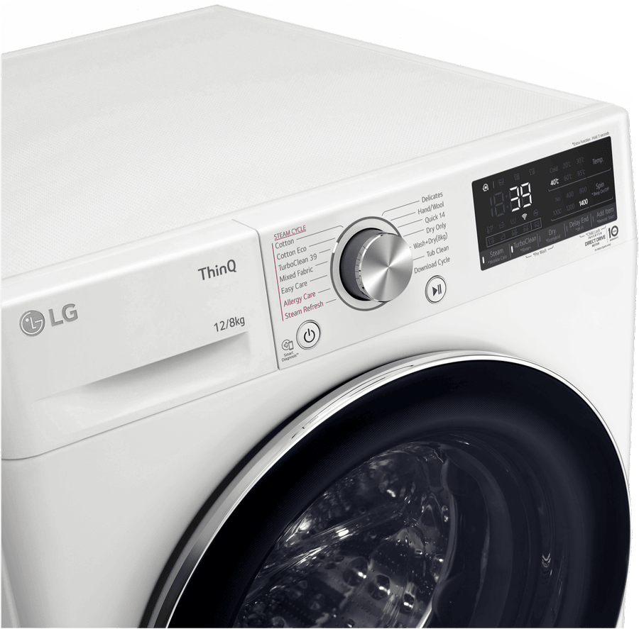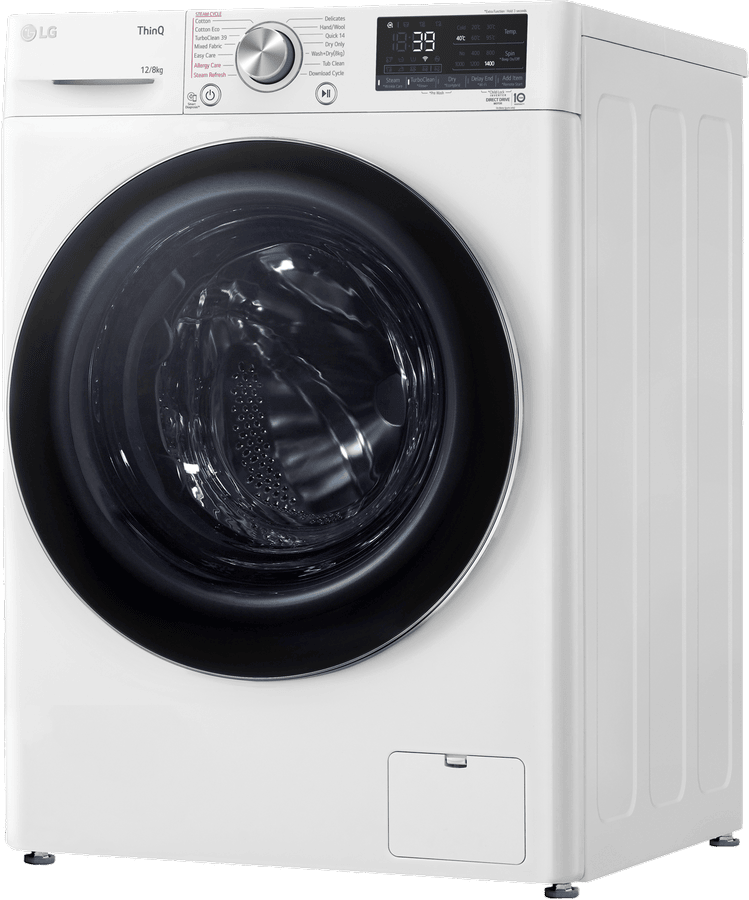 Discover the ultimate in laundry care with the LG 12kg Combo Washer Dryer. This large capacity front loader offers superior fabric care for all your washing needs. With a generous 12kg washing capacity, 1400rpm max spin speed, and 8kg drying capacity, it handles even the largest loads with ease. The 4.5 star energy and water ratings make it an eco-friendly choice that’s kind on your utility bills and the environment. The LG Series 9 washer dryer features AI DD Intelligent Fabric Care technology to customize wash cycles for optimal results. The Allergy Care cycle with steam eliminates up to 99.9% of dust mites and select allergens. Smart ThinQ capabilities let you control and monitor cycles remotely. With 16 specialized wash programs like Cotton, Mixed Fabric, Delicates, Hand Wool and TurboClean 39, clothes get the tailored care they need. Variable temperature and spin speed settings allow further customization. In sleek white with a large 600mm width, this combo unit delivers powerful cleaning performance while complementing modern laundry rooms. The intuitive control panel makes operation a breeze. With durable construction and a 2 year manufacturer’s warranty, the LG 12kg Combo Washer Dryer provides long-lasting quality and convenience. The manufacturer’s part number for this product is WVC9-1412W. Discover the possibilities with this feature-packed washer dryer today.