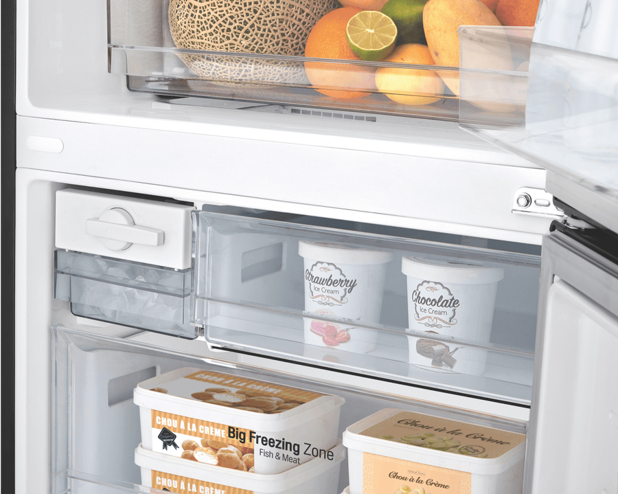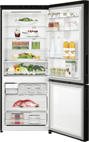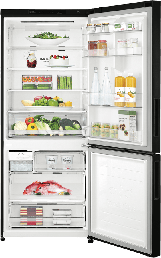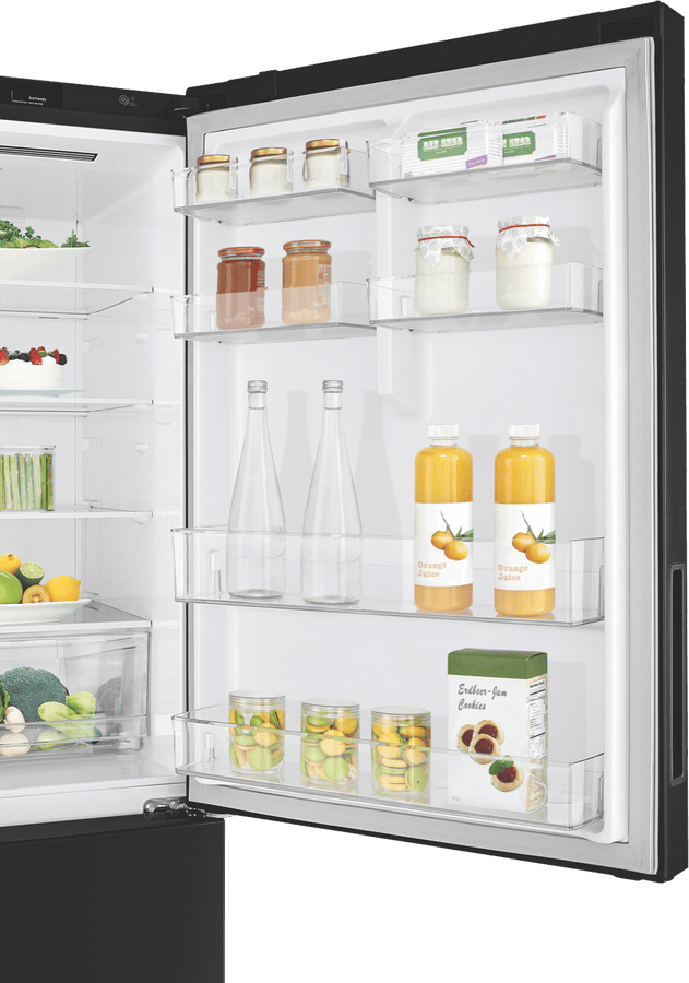 Bring sleek modern style and convenient cooling to your kitchen with the spacious 420 litre LG 420L Bottom Mount Refrigerator. This bottom freezer fridge comes in a stylish black finish that will complement any décor. With generous 420 litre total capacity, including a cavernous 287 litre refrigerator and 133 litre freezer, this LG appliance provides ample fresh food and frozen storage. The right hand hinged door is reversible for flexible placement, while 5 star energy rating ensures excellent efficiency. Additional features like Door Cooling and Moisture Balance Crisper help keep food fresher longer. Measuring 700mm wide, 1720mm high, and 700mm deep, with black steel finish, this refrigerator delivers premium cooling and storage. Backed by a 2 year manufacturer’s warranty, the LG 420L Bottom Mount Refrigerator provides exceptional performance. Discover how this quality bottom freezer refrigerator can upgrade your kitchen. The manufacturer’s part number for this product is GB-455BTL. Contact us today to learn more about this refrigerator.