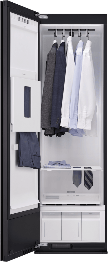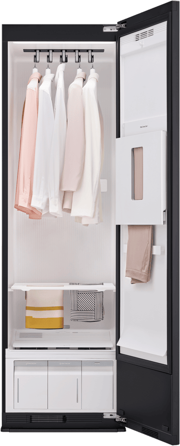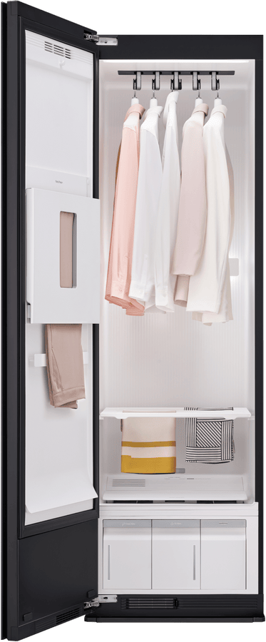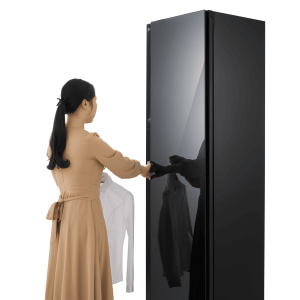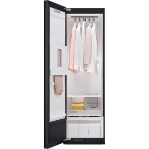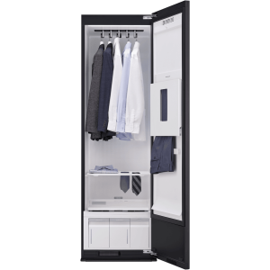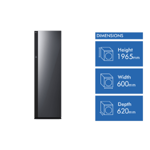 Keep your clothes fresh and wrinkle-free with this 5-garment TrueSteam Styler. The built-in HandySteamer tackles stubborn wrinkles while the heat pump technology gently refreshes your clothes without harsh heat. Since it’s freestanding with a right-hinged door that’s reversible, you can position it wherever works best in your home. Connect to the ThinQ app to control your styler remotely, while the child lock keeps curious little ones safe. Standing at 1965mm tall with a sleek mirror black finish, it comes with a 2-year warranty. Model SC5MBH.