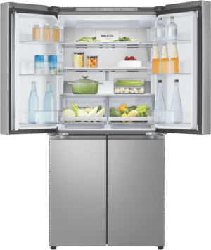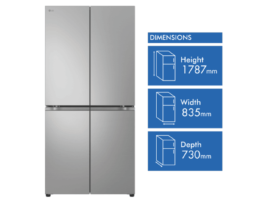 This LG 530L silver french door fridge provides ample food storage with a total capacity of 530 liters. The dual hinged doors open up to reveal 321 liters of fridge space and 209 liters of freezer space, letting you store all your fresh and frozen foods. Six freezer drawers give you plenty of room to organize meats, frozen meals, and ice cream. Inside the fridge, two large crisper drawers keep fruits and veggies fresh using Multi Air Flow cooling. With the LG ThinQ app, you can control and monitor your fridge from anywhere. Digital sensors track temps precisely while the door alarm lets you know if the door gets left open. At 835mm wide, 1787mm high, and 730mm deep, this fridge fits most kitchen spaces. The stainless steel finish resists fingerprints and matches any decor. Enjoy the convenience of ample storage space with this spacious and smart LG french door refrigerator, model number GF-B505PL. Backed by a 2 year manufacturer’s warranty.