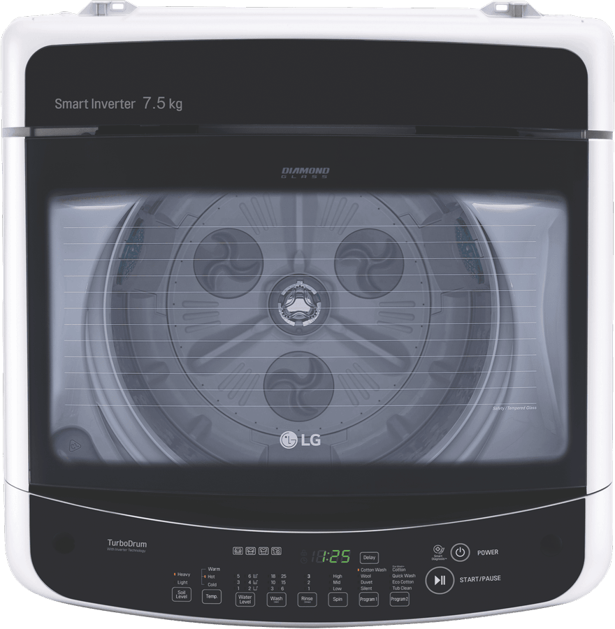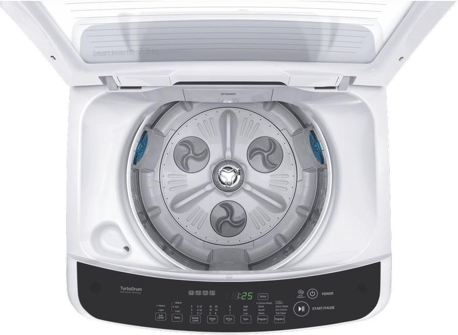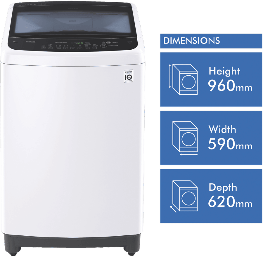 Discover the perfect laundry companion with the LG 7.5kg Top Load Washer. With a generous 7.5kg washing capacity, this top loader makes light work of the weekly wash for medium to large households. The sleek white finish will blend seamlessly into any modern laundry, while the durable build promises years of reliable service. The Eco Cotton program helps you wash clothes efficiently using less water and energy. The Smart Inverter Control provides quiet washing by optimizing rotations for the selected wash program. The wide glass lid lets you view the wash cycle easily. Inside, the TurboDrum improves wash performance through enhanced drum rotations. With handy features like Delay Start, this washer lets you schedule washing to suit your routine. The LG top loader is also designed for convenience. Programs like Quick Wash help finish laundry fast when time is limited. The easy 3 second press on the water level gives you control over the wash. With both hot and cold wash options plus a choice of 8 versatile programs, you can customize each load. Rinse and spin settings also allow flexibility.Simply load, select your settings, and let the washer handle the hard work while you get on with your day. With a 3 star WELS water rating and 3 star energy rating, the LG 7.5kg Top Loader makes an eco-friendly, family-sized addition to any laundry. The manufacturer’s part number for this product is WTG7520. Check out the LG Top Load Washer for an effortless wash day experience.
