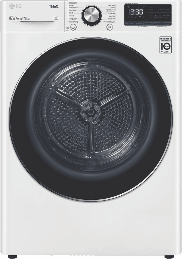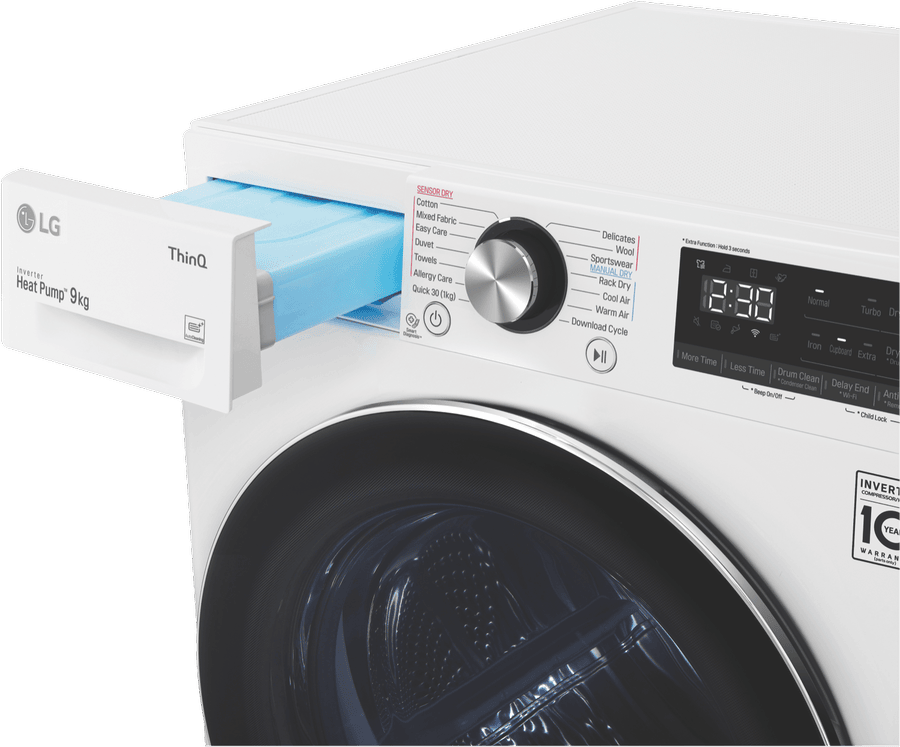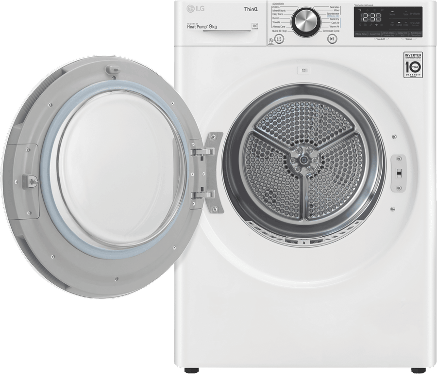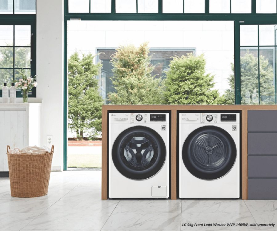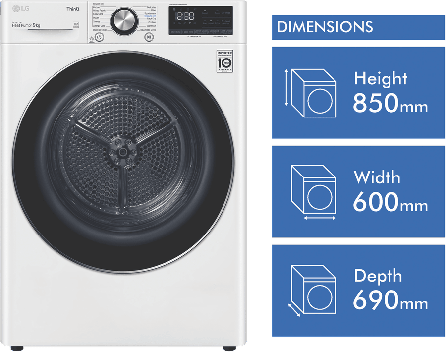 Equipped with LG’s Inverter Compressor and heat pump technology to make a Super-Efficient 9 Star Energy Rating possible, this LG Heat Pump Dryer DVH9-09W offers both energy savings and optimal care of clothing in a 9kg capacity stainless steel drum. A heat pump dryer dries fabrics carefully and efficiently and does not require venting to the outside so they’re perfect if you’re renting. This LG dryer is designed to care for what you wear with Sensor Dry cycles including Allergy Care, Easy Care, Wool, or Delicates for dedicated fabric treatment with no overdrying. Select a Time Dry cycle like Rack Dry in conjunction with the included Drying Rack for drying off wet hats, scarves or shoes. Its clever Auto Cleaning Condenser removes lint and dirt with its automatic condenser clean function; ensuring your dryer runs both optimally and hygienically. Plus, with LG ThinQ with Smart Pairing* this LG heat pump dryer automatically sets the best dry cycle based on the last wash in your connected LG front load washer. It is 850mm high, 600mm wide, and 690mm deep, so take careful measurements of where your dryer needs to fit, leaving enough room for the door to open. *Compatible smartphone required, Android 4.1.2 (JellyBean) or later or iOS 9 or later required for LG ThinQ application.