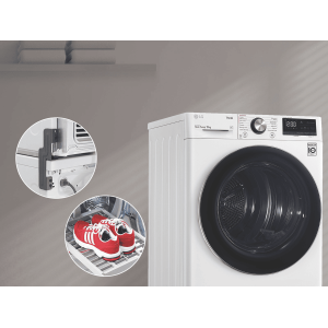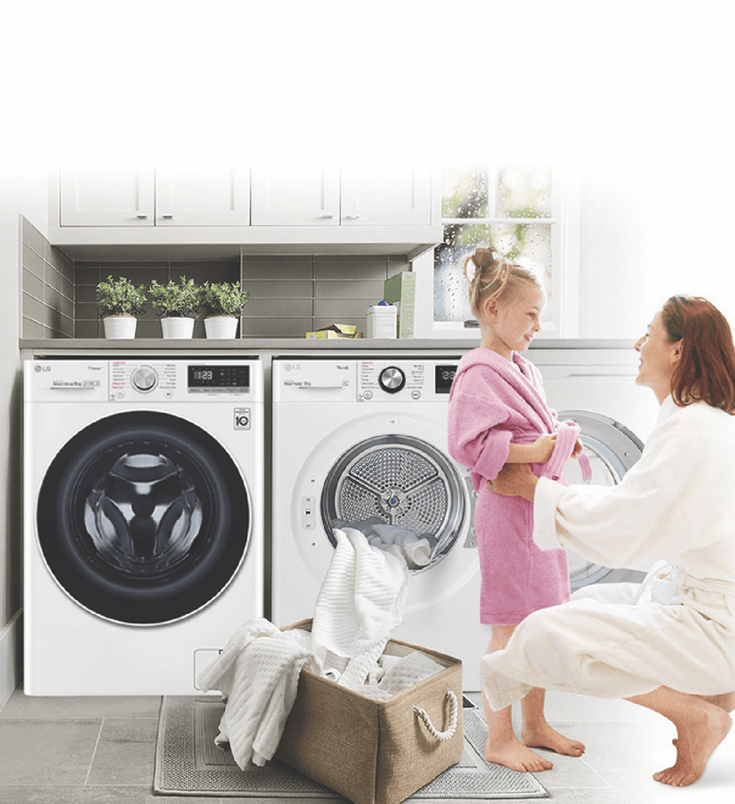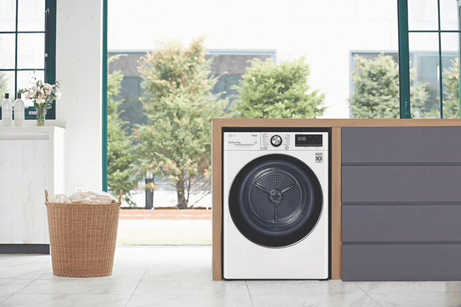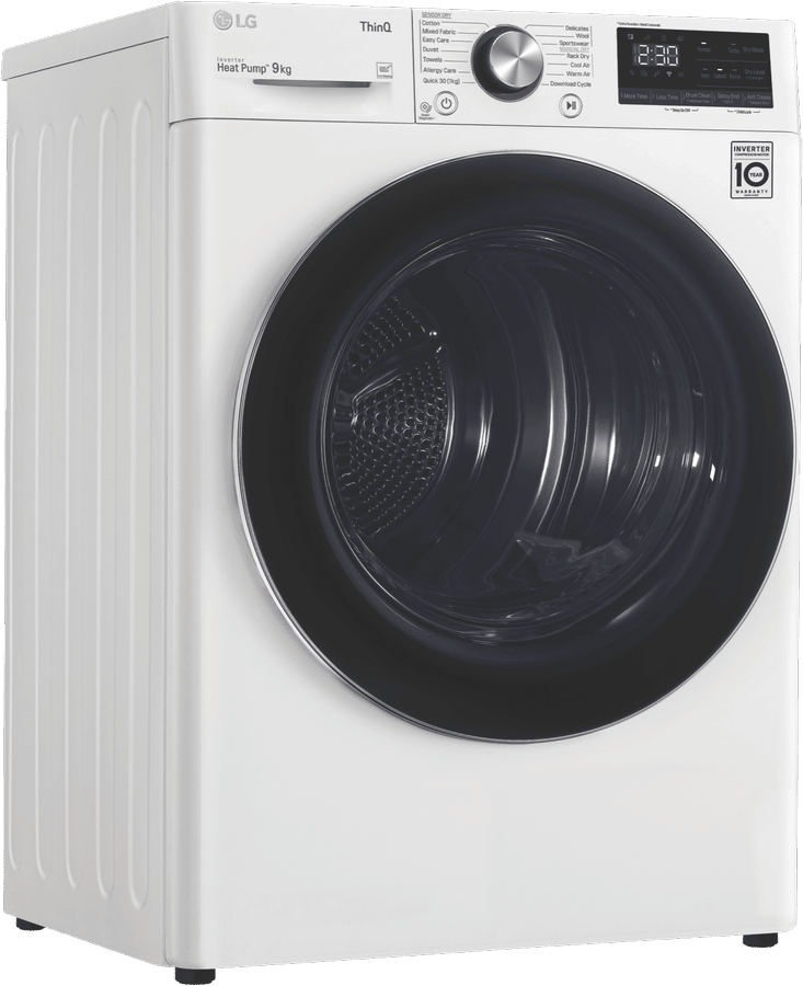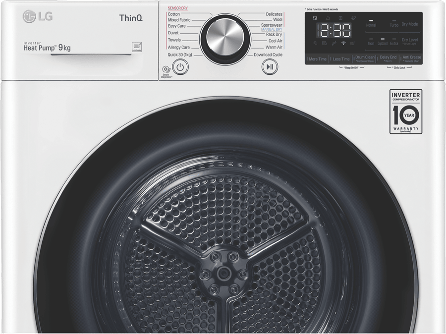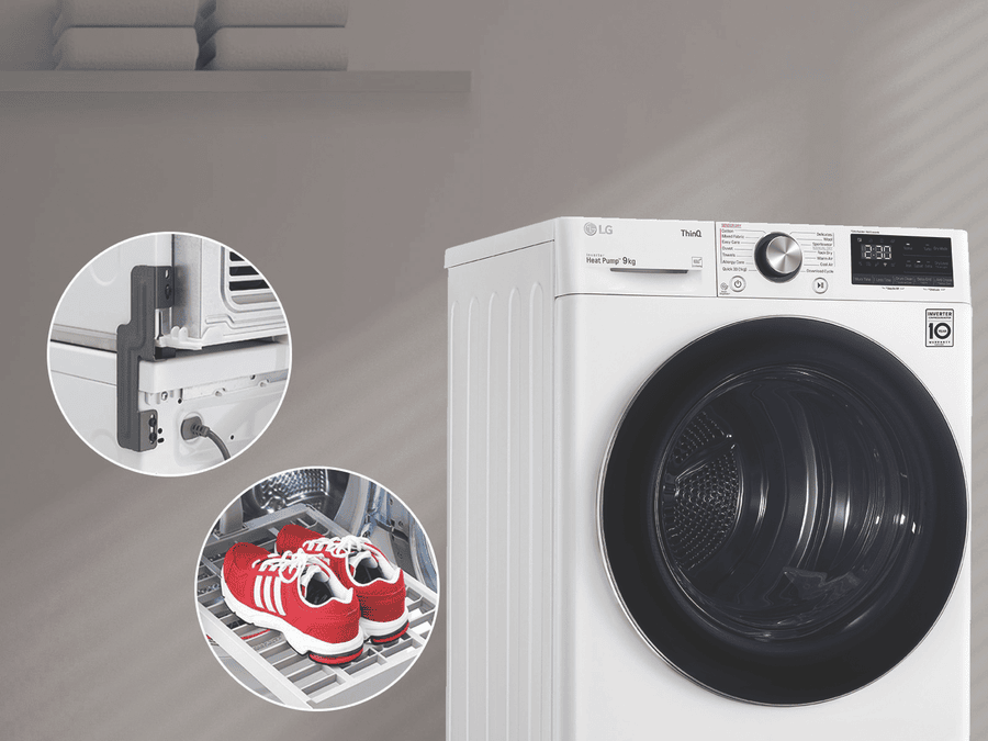 Equipped with LG’s Inverter Compressor and heat pump technology to make a Super-Efficient 9 Star Energy Rating possible, this LG Heat Pump Dryer DVH9-09W offers both energy savings and optimal care of clothing in a 9kg capacity stainless steel drum. A heat pump dryer dries fabrics carefully and efficiently and does not require venting to the outside so they’re perfect if you’re renting. This LG dryer is designed to care for what you wear with Sensor Dry cycles including Allergy Care, Easy Care, Wool, or Delicates for dedicated fabric treatment with no overdrying. Select a Time Dry cycle like Rack Dry in conjunction with the included Drying Rack for drying off wet hats, scarves or shoes. Its clever Auto Cleaning Condenser removes lint and dirt with its automatic condenser clean function; ensuring your dryer runs both optimally and hygienically. Plus, with LG ThinQ with Smart Pairing* this LG heat pump dryer automatically sets the best dry cycle based on the last wash in your connected LG front load washer. It is 850mm high, 600mm wide, and 690mm deep, so take careful measurements of where your dryer needs to fit, leaving enough room for the door to open. *Compatible smartphone required, Android 4.1.2 (JellyBean) or later or iOS 9 or later required for LG ThinQ application.
