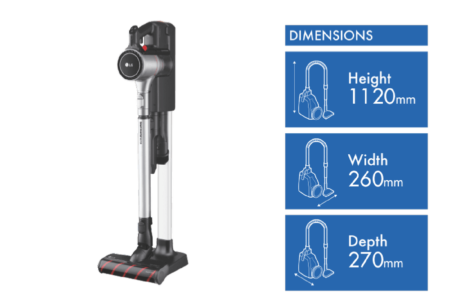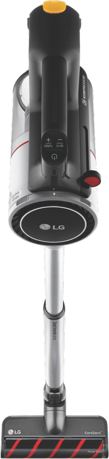Cleaning becomes less of chore with A9K-EVOLVE Stick Vacuum. With the addition of a mechanism in the dustbin that compresses dust and debris to fit up to 2.4 times more dust and hair(1) to give you more cleaning time in-between trips to the bin. Powerful suction with the Smart Inverter(t) Motor and Axial Turbo Cyclone, helps deliver powerful long lasting suction. An upgraded five-step filtration system that includes a HEPA filter to capture fine dust and dirt and a washable filter aids in keeping this LG stick vacuum running hygienically and efficiently. Now with WiFi connectivity, you can link your A9 Kompressor to the LG ThinQ app to easily check your cleaning history and simply diagnose issues all from your smartphone(3). Up to 120 minutes run time with the Dual PowerPack(2). Disclaimers: (1) Up to 2.4 times more hair and dust compared to the uncompressed capacity. Results may vary depending on operating environment. (2) Up to 120 minutes run time when using 2 batteries in starting ‘normal’ mode without Power Drive Nozzle. Battery life may vary depending on the operating environment and settings. (3) Compatible mobile phone required (Android 4.1.2(JellyBean) or later or Apple iOS 9 or later). Mobile and Home Wi-Fi Data connection required.