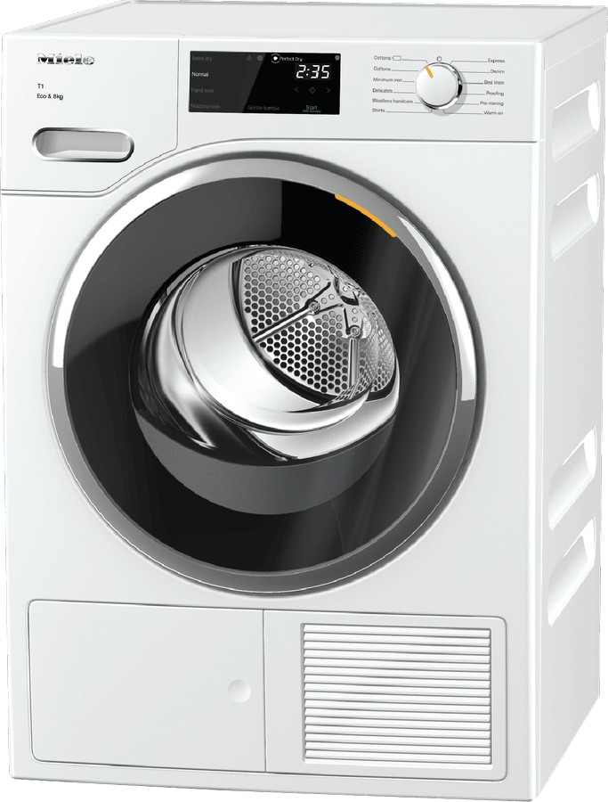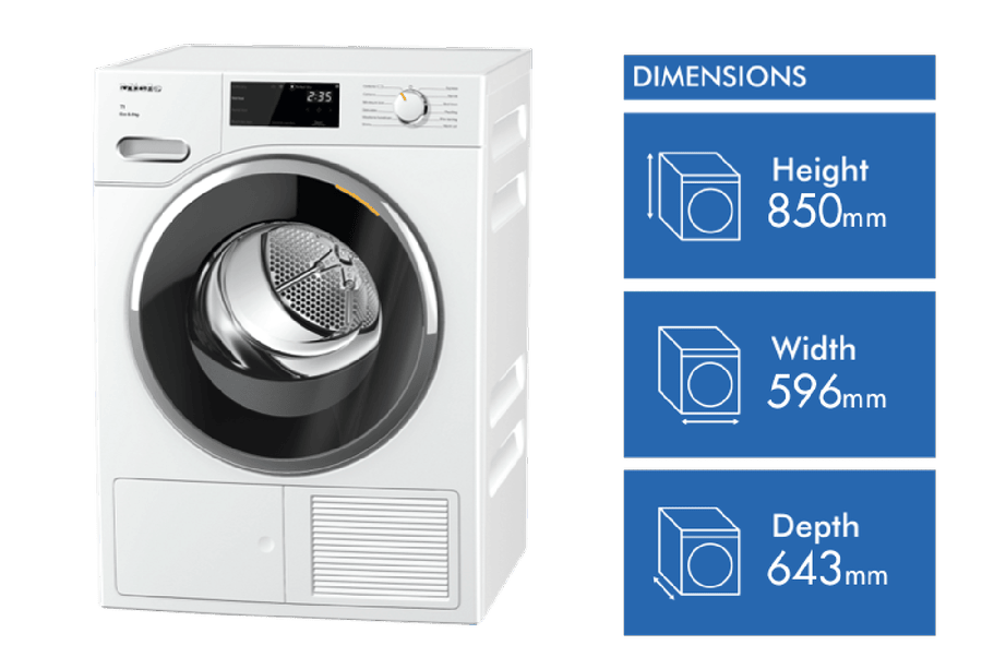This white Miele heat pump dryer has the capacity to dry 8 kg (1kg = the weight of one dry towel) or one queen doona, which is perfect for households of three or four. A heat pump dryer dries fabrics more carefully and efficiently than other types of dryers, which protects clothes and helps with power bill savings. Heat pump dryers don’t need to be vented outside so they’re perfect if you’re renting. Save energy with its very high 10 star energy rating. Also, the white Miele TWF 720 WP features 12 types of drying programs, allowing you to select the best setting for each load. It’s 850mm high, 596mm wide, and 643mm deep, so take carfeful measurements of where your dryer needs to fit, leaving enough room for the door to open.