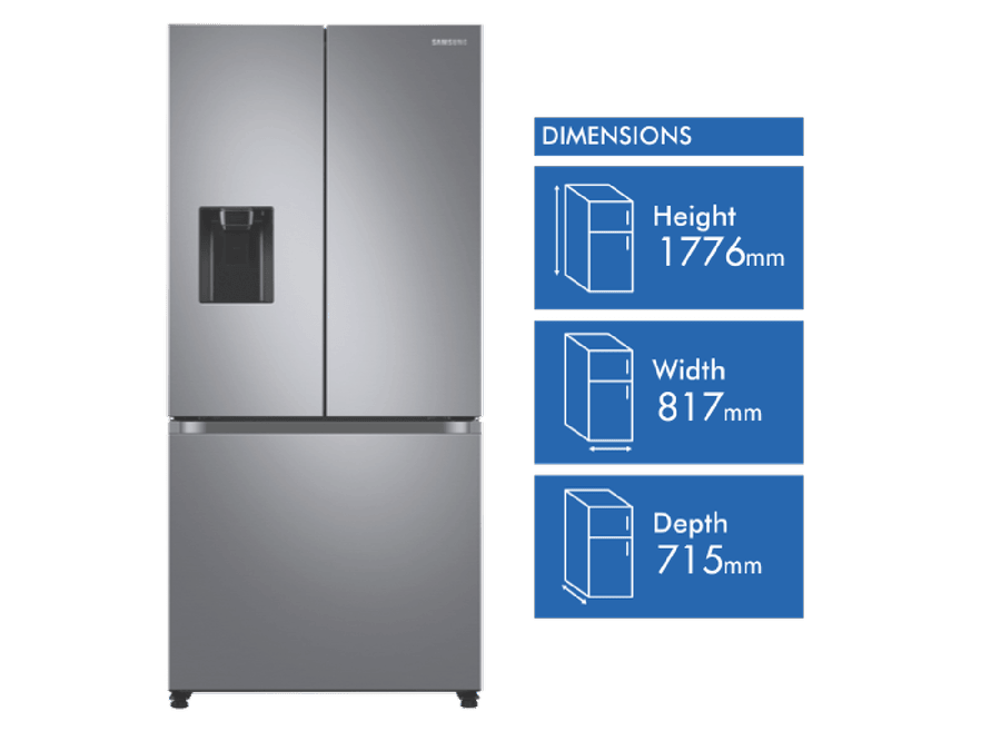 Premium design and excellent functionality come together with the Samsung 495L French Door Refrigerator (SRF5300SD). Keeping your fridge and freezer separately cool is the Twin Cooling Plus technology(1); this feature keeps odours isolated to each area and maintains the perfect temperature and humidity for food preservation. Power Freeze distributes a fast current of cold air into your freezer to quickly chill your frozen food. The Power Cool function similarly blows cold air into the refrigerator cabin to promptly chill food and drinks. Refreshing water is always available without the need of a tap; the built in water dispenser provides refreshing chilled water from the fridge without installation(2). The large capacity door bins allow easy access to large bottles and jugs with compromising on space. Also, the large capacity crispers provide even more space to store your favourite fruit and vegetables. The Auto Ice Maker ensures you have access to a large quantity of ice all year round(3). The exterior of the Samsung fridge comes with an Anti-Fingerprint finish; this prevents left over fingerprints from staying on the outside surface, keeping its high quality aesthetics. Constructed to fit into the Australian Kitchen this French Door Refrigerator can fit within a standard 1800mm high / 900mm wide cavity(4). (1) Based on testing comparing Samsung Twin Cooling Plus with Samsung All Around / Mono Cooling Systems. (2) On demand water from the dispenser is subject to the container being re-filled. Bisphenol A (BPA) is found in polycarbonate plastics and epoxy resins, which are often used in food and beverage containers, and has been linked with possible adverse health effects. (3) On demand ice from the auto ice maker is subject to the unit being plumbed. (4) Fits a standard 1800mm high / 900mm wide cavity. Please review full fridge dimensions to determine suitability.